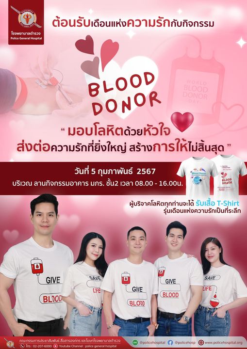 โรงพยาบาลตำรวจ เชิญชวนบริจาคโลหิต ต้อนรับเดือนแห่งความรักกับกิจกรรม “มอบโลหิตด้วยหัวใจ ส่งต่อความรักที่ยิ่งใหญ่ สร้างการให้ไม่สิ้นสุด” กับโรงพยาบาลตำรวจ ในวันที่ 5 กุมภาพันธ์ 2567 ณ ลานกิจกรรม อาคาร มภร.ชั้น 2 เวลา 8.00 – 16.00 น. และผู้บริจาคโลหิตในวันที่ 5-29 กุมภาพันธ์ 2567 จะได้รับเสื้อ T -shirt รุ่นเดือนแห่งความรักเป็นที่ระลึก