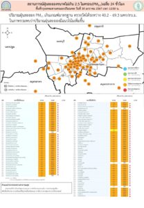 - กรุงเทพมหานครและปริมณฑล เกินค่ามาตรฐานเป็นส่วนใหญ่ ตรวจวัดได้ 40.2 – 69.3 ไมโครกรัมต่อลูกบาศก์เมตร