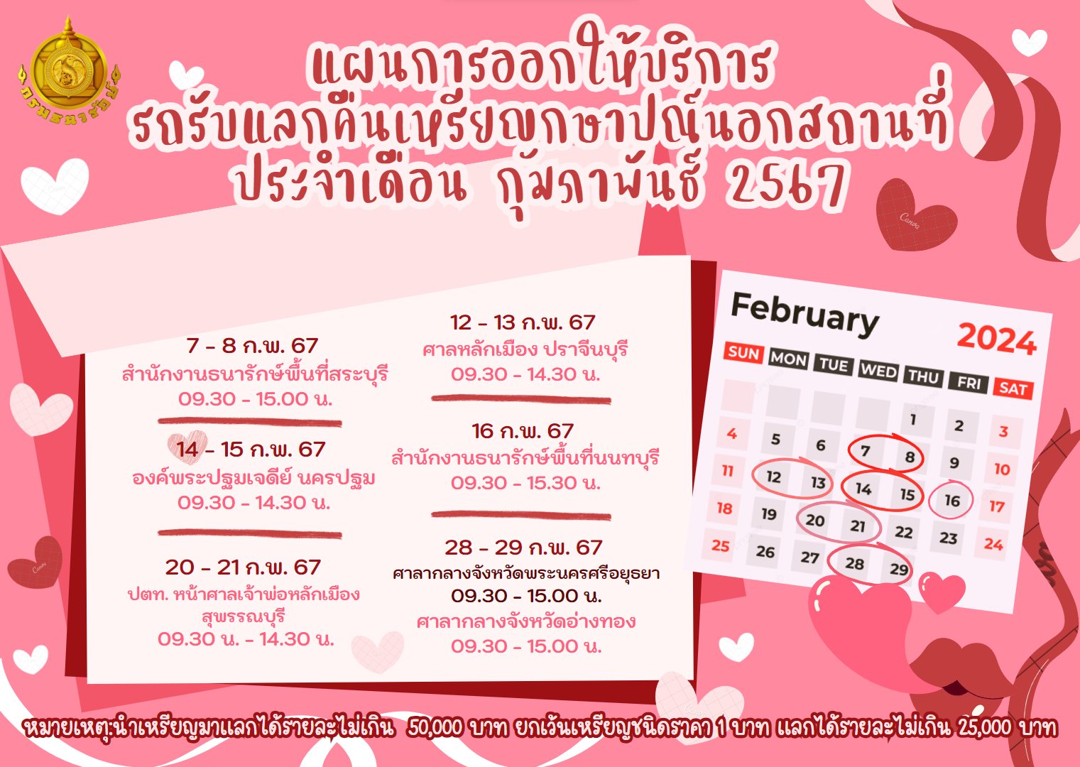 หมายเหตุ : ขอสงวนสิทธิ์ให้ประชาชนนำเหรียญมาแลกได้รายละไม่เกิน 50,000 บาท