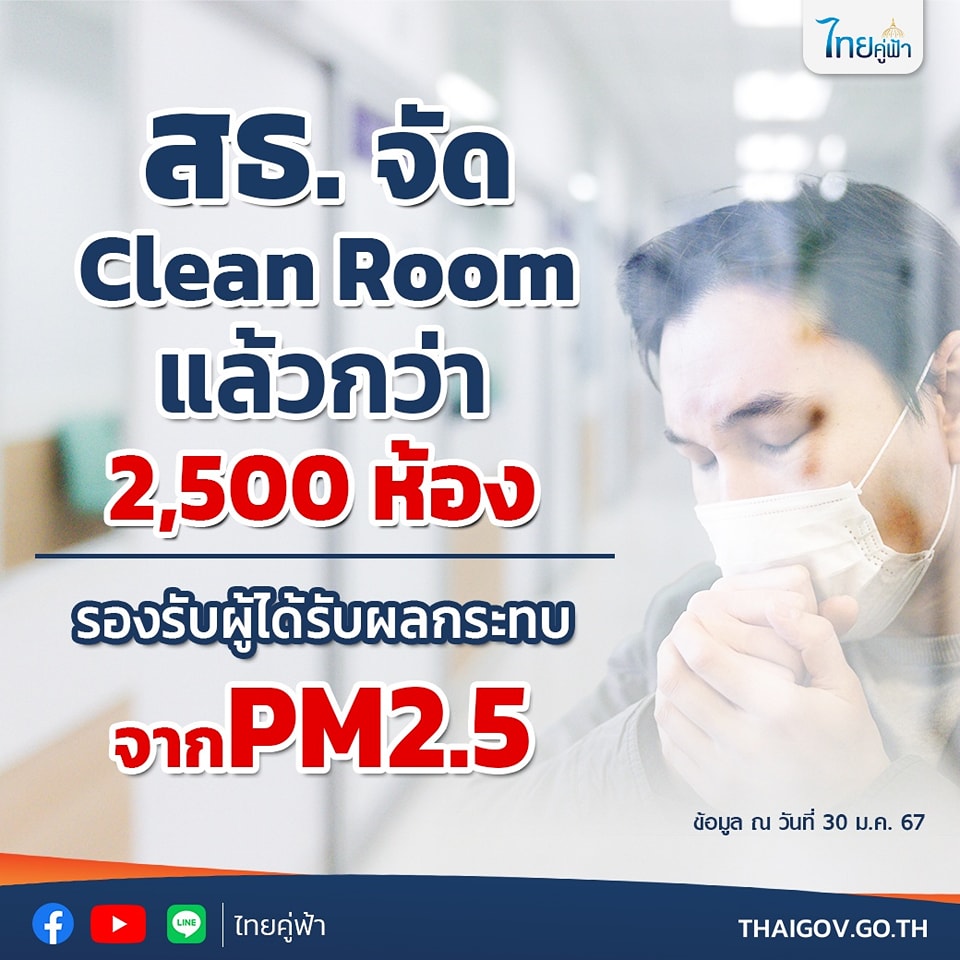 กระทรวงสาธารสุข เผยขณะนี้ โรงพยาบาลสังกัดสำนักงานปลัดกระทรวงสาธารณสุข เขตสุขภาพที่ 1, 2, 3, 8 และปริมณฑล ซึ่งเป็นพื้นที่เสี่ยงสูงจาก PM2.5 ได้จัดทำห้องปลอดฝุ่น (Clean Room) ให้กลุ่มเสี่ยงได้เข้าพัก เพื่อลดโอกาสรับสัมผัสมลพิษทางอากาศจากฝุ่น PM2.5 จำนวนทั้งสิ้น 2,053 ห้อง สามารถรองรับ ปชช.กลุ่มเสี่ยง ได้ประมาณ 33,000 คน ใน 30 จังหวัด
