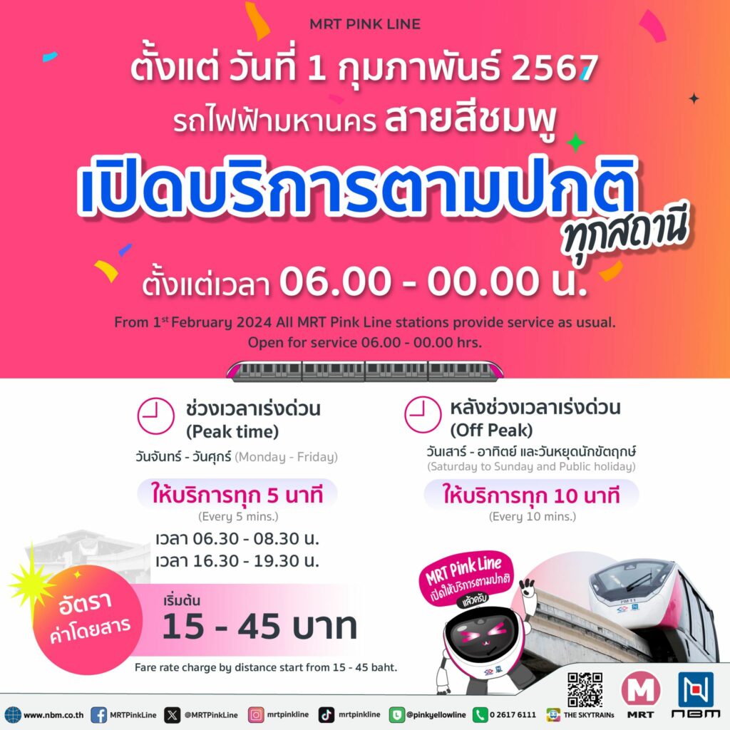 รถไฟฟ้าสายสีชมพู เปิดให้บริการตามปกติทุกสถานี เริ่มวันที่ 1 กุมภาพันธ์ 2567 เป็นต้นไป