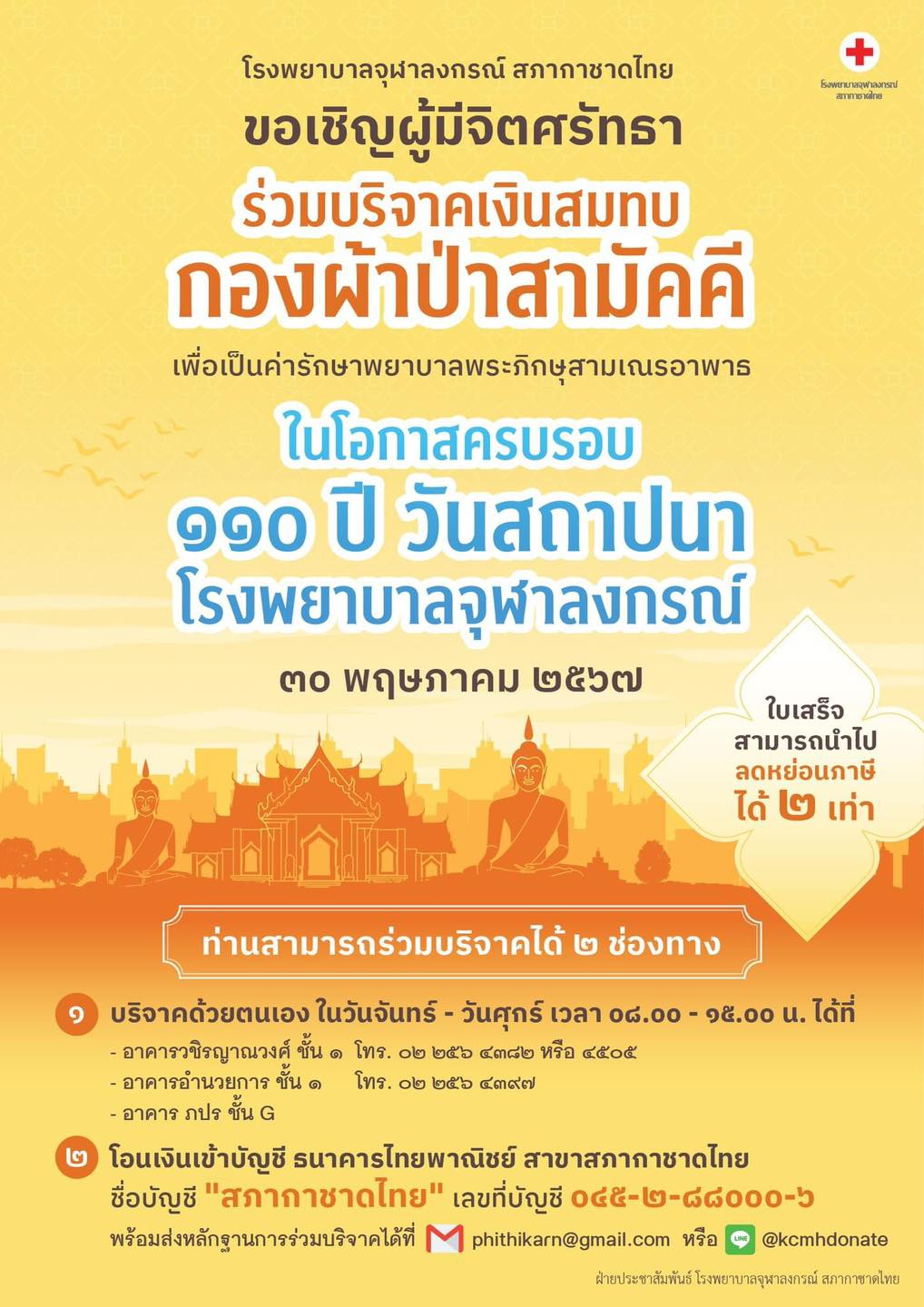 โรงพยาบาลจุฬาลงกรณ์ สภากาชาดไทย ขอเชิญผู้มีจิตศรัทธาร่วมบริจาคเงินสมทบ กองผ้าป่าสามัคคี เพื่อเป็นค่ารักษาพยาบาลพระภิกษุสามเณรอาพาธ ในโอกาสครบรอบ 110 ปี วันสถาปนาโรงพยาบาลจุฬาลงกรณ์ 30 พฤษภาคม 2567