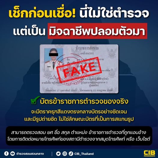 ตำรวจสอบสวนกลาง แนะนำเช็กก่อนเชื่อ นี่ไม่ใช่ตำรวจ แต่เป็นมิจฉาชีพปลอมตัวมา