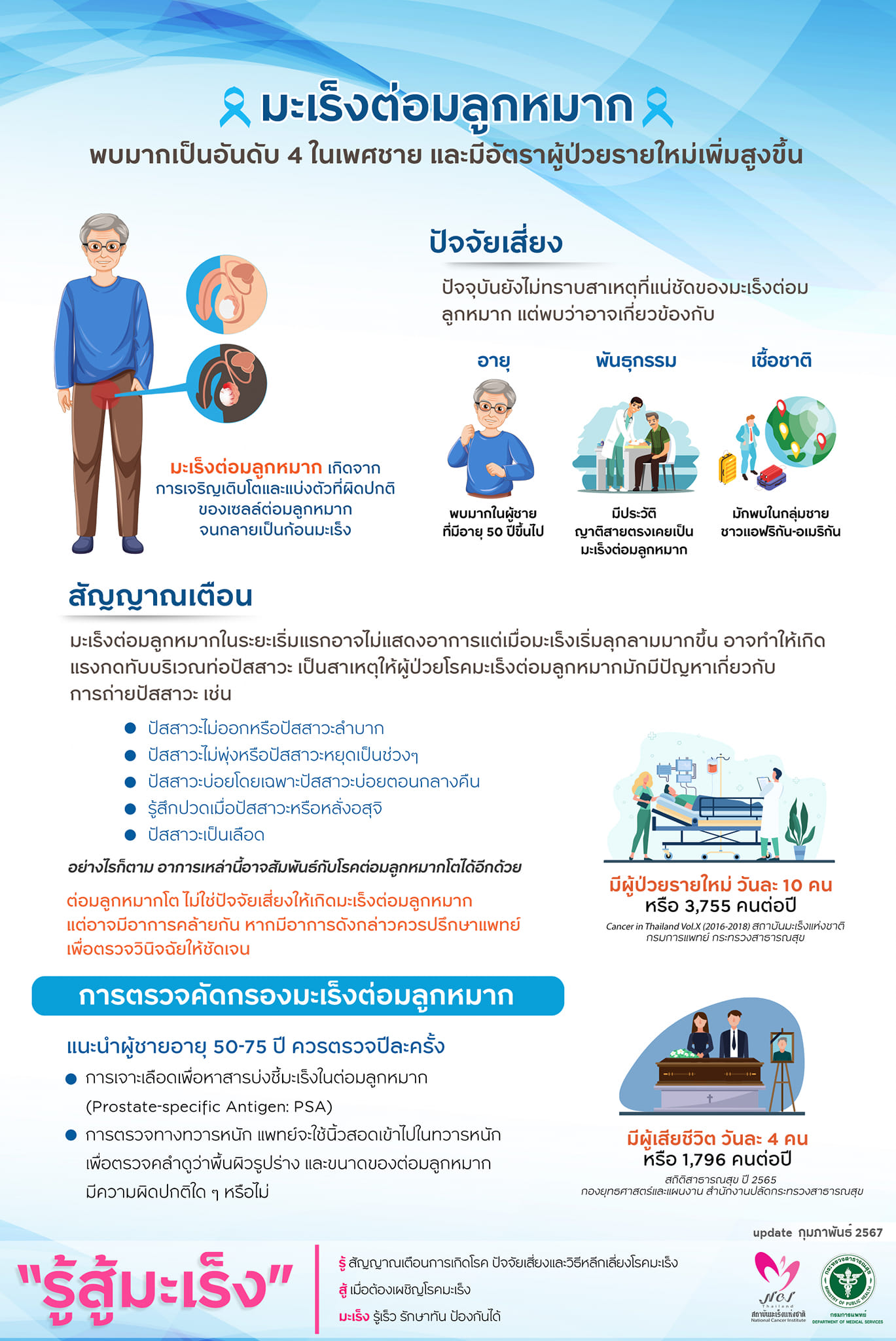 แพทย์หญิงอัมพร เบญจพลพิทักษ์ อธิบดีกรมการแพทย์ เปิดเผยว่า ต่อมลูกหมาก เป็นอวัยวะที่มีเฉพาะในเพศชาย มีหน้าที่ในการสร้างน้ำหล่อลื่นระหว่างมีเพศสัมพันธ์และสารเลี้ยงอสุจิ สำหรับมะเร็งต่อมลูกหมาก พบมากในผู้ที่อายุ 50 ปีขึ้นไป ผู้ที่มีบิดา พี่ชาย หรือน้องชายเป็นมะเร็ง ต่อมลูกหมากจะมีความเสี่ยงเพิ่มขึ้น จากสถิติการเกิดโรคมะเร็งของสถาบันมะเร็งแห่งชาติ (Cancer in Thailand Vol.X 2016-2018) พบว่าอุบัติการณ์การเกิดมะเร็งต่อมลูกหมาก คือ 3,755 ราย โดยพบเป็นลำดับที่ 4 ของมะเร็งในเพศชาย อาการแสดง มะเร็งต่อมลูกหมากในระยะเริ่มต้นอาจไม่มีอาการ มักจะตรวจพบจากการตรวจสุขภาพประจำปี หรือจากการพบสารบ่งชี้มะเร็งต่อมลูกหมากในเลือด (serum PSA: serum prostatic specific antigen) สูงเกินค่าปกติ แต่เมื่อเซลล์มะเร็งมีการขยายตัวจนเบียดท่อปัสสาวะ อาจทำให้ปัสสาวะลำบาก ปัสสาวะไม่พุ่ง กลั้นปัสสาวะไม่อยู่ ปวดแสบเวลาปัสสาวะ มีเลือดปนมากับปัสสาวะหรืออสุจิ (อาการบางอย่างอาจคล้ายกับโรคต่อมลูกหมากโต แต่ต่อมลูกหมากโตไม่ใช่ปัจจัยเสี่ยงให้เกิดมะเร็งต่อมลูกหมาก ดังนั้น หากมีอาการดังกล่าวควรปรึกษาแพทย์เพื่อตรวจวินิจฉัยให้ชัดเจน) และในกรณีมะเร็งเข้าสู่ระยะลุกลามอาจทำให้เกิดอาการปวดหลังหรือปวดสะโพก กระดูกหักโดยไม่ทราบสาเหตุ น้ำหนักลด ขาบวม หรือตัวเหลืองตาเหลืองได้ การวินิจฉัยมะเร็งต่อมลูกหมาก ทำโดยการเจาะเก็บชิ้นต่อมลูกหมากทางทวารหนักแบบสุ่ม แต่ในปัจจุบันมีทางเลือกในการตรวจวินิจฉัยที่มากยิ่งขึ้น ได้แก่ การเอ็กซเรย์ คลื่นแม่เหล็กไฟฟ้าบริเวณต่อมลูกหมาก หากพบว่ามีบริเวณที่น่าสงสัย จะเกิดมะเร็งต่อมลูกหมาก จะนำภาพเอ็กซเรย์ดังกล่าวเป็นแผนภาพนำทางในการเจาะชิ้นเนื้อต่อมลูกหมาก ทำให้ช่วยลดจำนวนชิ้นเนื้อที่ต้องเจาะเก็บ ลดการเจาะชิ้นเนื้อในรายที่ความเสี่ยงต่ำ และเพิ่มโอกาสตรวจเจอมะเร็งต่อมลูกหมากมากยิ่งขึ้น