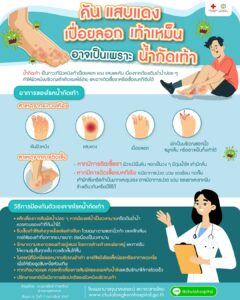 โรงพยาบาลจุฬาลงกรณ์ สภากาชาดไทย แนะคัน แสบแดง เปื่อยลอก เท้า เหม็นอาจเป็นเพราะ น้ำกัดเท้า โดย น้ำกัดเท้า เป็นภาวะที่ผิวหนังเท้าเปื่อยลอก แดง แสบและคันเนื่องจากต้องเดินย่ำน้ำบ่อย ๆ ทำให้ผิวหนังบริเวณเท้าเกิดแผลได้ง่าย และอาจติดเชื้อราหรือเชื้อแบคทีเรียได้