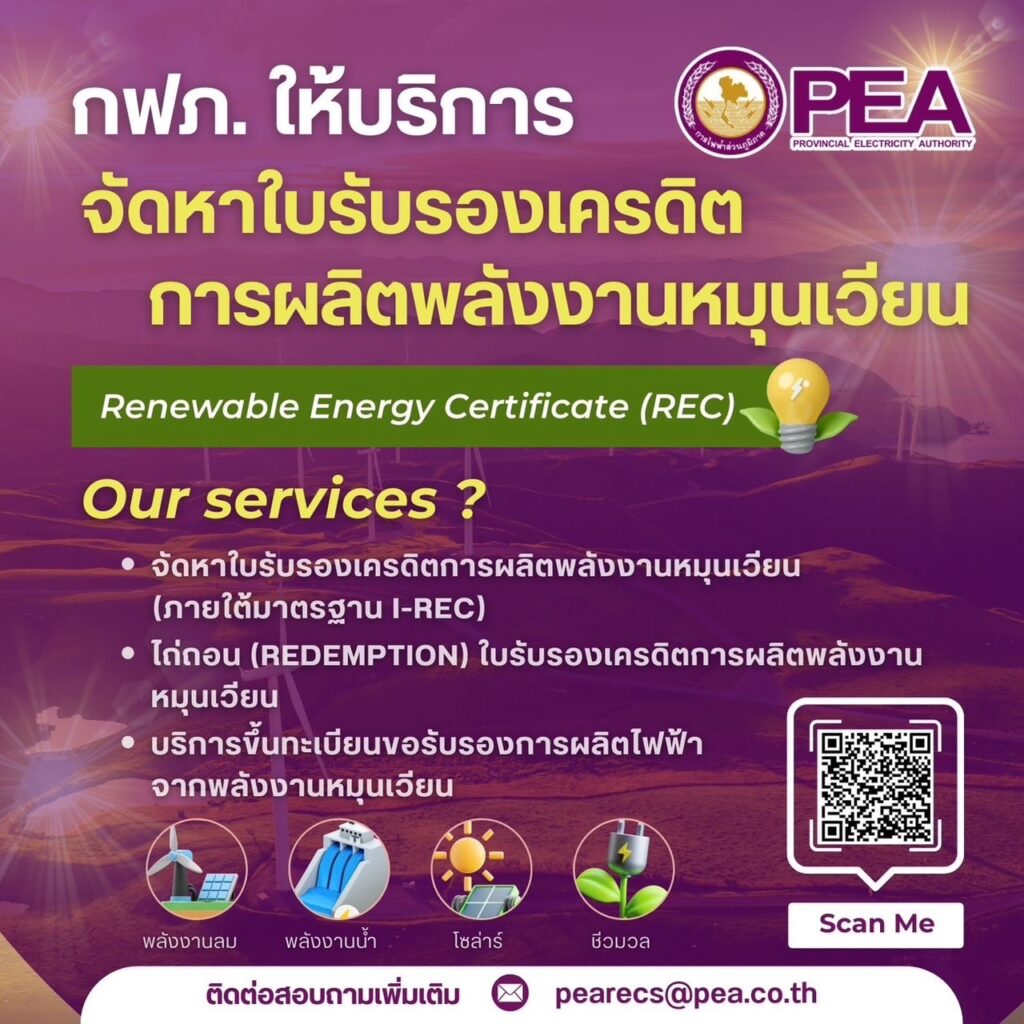 การไฟฟ้าส่วนภูมิภาค ให้บริการจัดหาใบรับรองเครดิตการผลิตพลังงานหมุนเวียน