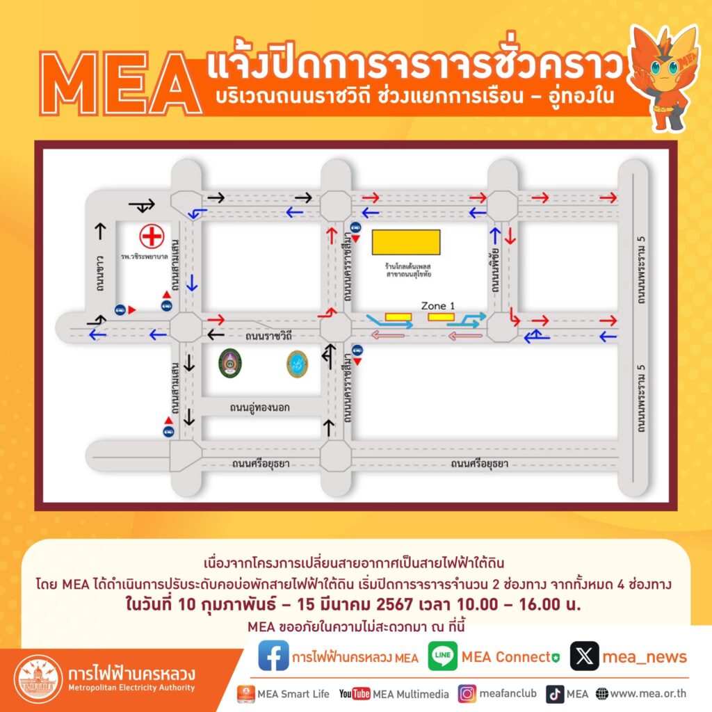 การไฟฟ้านครหลวง แจ้งปิดการจราจรชั่วคราว บริเวณถนนราชวิถี ช่วงแยกการเรือน – อู่ทองใน เนื่องจากโครงการเปลี่ยนสายอากาศเป็นสายไฟฟ้าใต้ดิน โดย MEA ได้ดำเนินการปรับระดับคอบ่อพักสายไฟฟ้าใต้ดินเริ่มปิดการจราจรจำนวน 2 ช่องทาง จากทั้งหมด 4 ช่องทาง ในวันที่ 10 กุมภาพันธ์ – 15 มีนาคม 2567 เวลา 10.00 – 16.00 น. MEA ขออภัยในความไม่สะดวกมา ณ ที่นี้