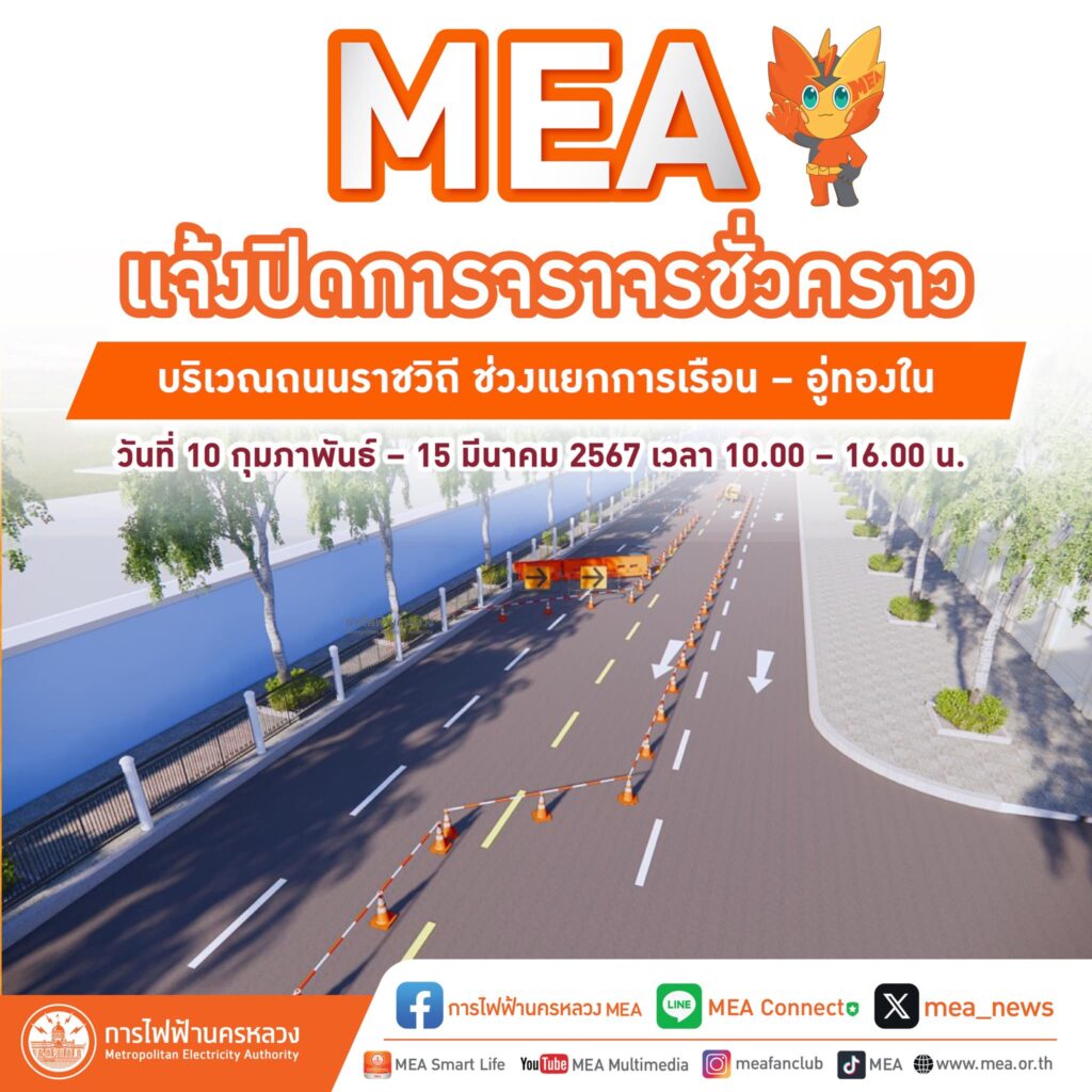 การไฟฟ้านครหลวง แจ้งปิดการจราจรชั่วคราว บริเวณถนนราชวิถี ช่วงแยกการเรือน – อู่ทองใน เนื่องจากโครงการเปลี่ยนสายอากาศเป็นสายไฟฟ้าใต้ดิน โดย MEA ได้ดำเนินการปรับระดับคอบ่อพักสายไฟฟ้าใต้ดินเริ่มปิดการจราจรจำนวน 2 ช่องทาง จากทั้งหมด 4 ช่องทาง ในวันที่ 10 กุมภาพันธ์ – 15 มีนาคม 2567 เวลา 10.00 – 16.00 น. MEA ขออภัยในความไม่สะดวกมา ณ ที่นี้