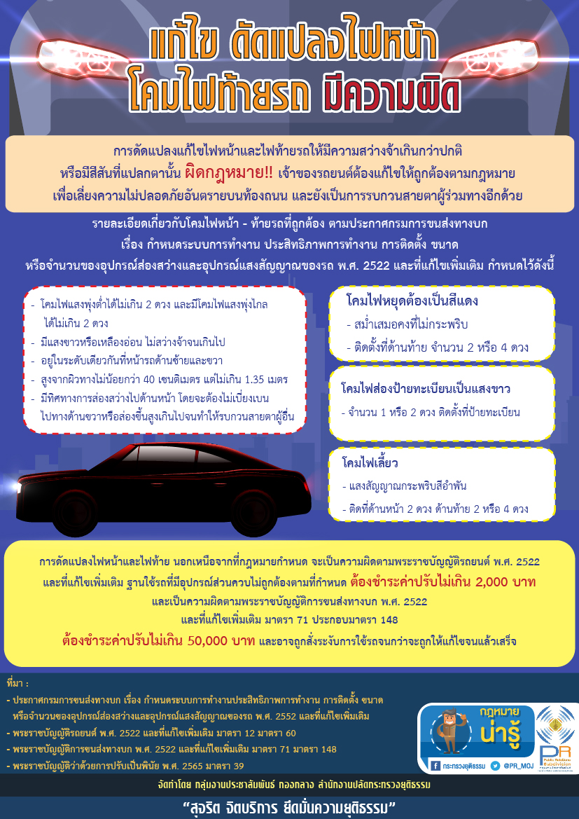 การดัดแปลงแก้ไขไฟหน้าและไฟท้ายรถให้มีความสว่างจ้าเกินกว่าปกติ หรือมีสีสันที่แปลกตานั้น ผิดกฎหมาย!! เจ้าของรถยนต์ต้องแก้ไขให้ถูกต้องตามกฎหมาย เพื่อเลี่ยงความไม่ปลอดภัยอันตรายบนท้องถนน และยังเป็นการรบกวนสายตาผู้ร่วมทางอีกด้วย