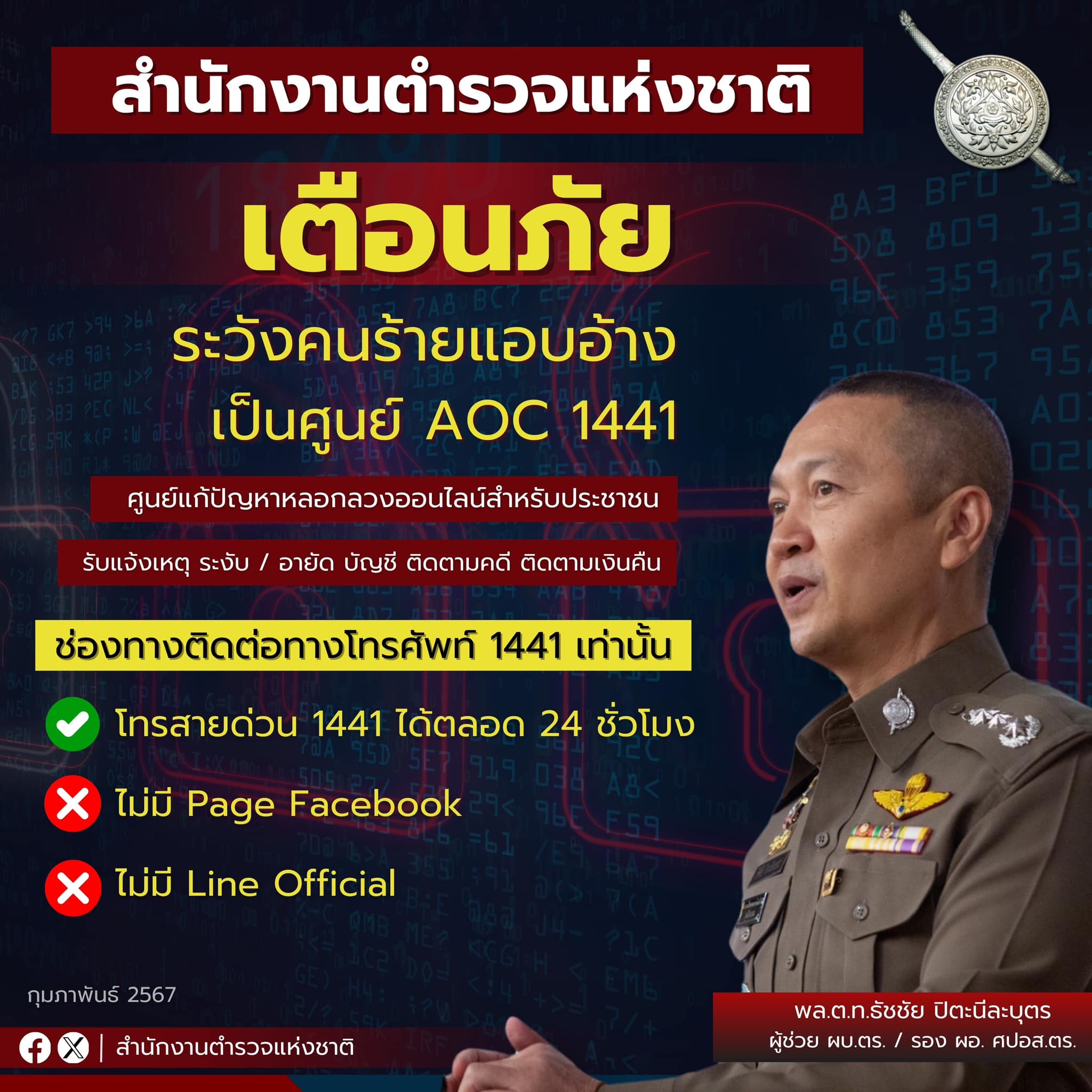 สำนักงานตำรวจแห่งชาติ เตือนภัย ระวังคนร้ายแอบอ้างเป็นศูนย์ AOC