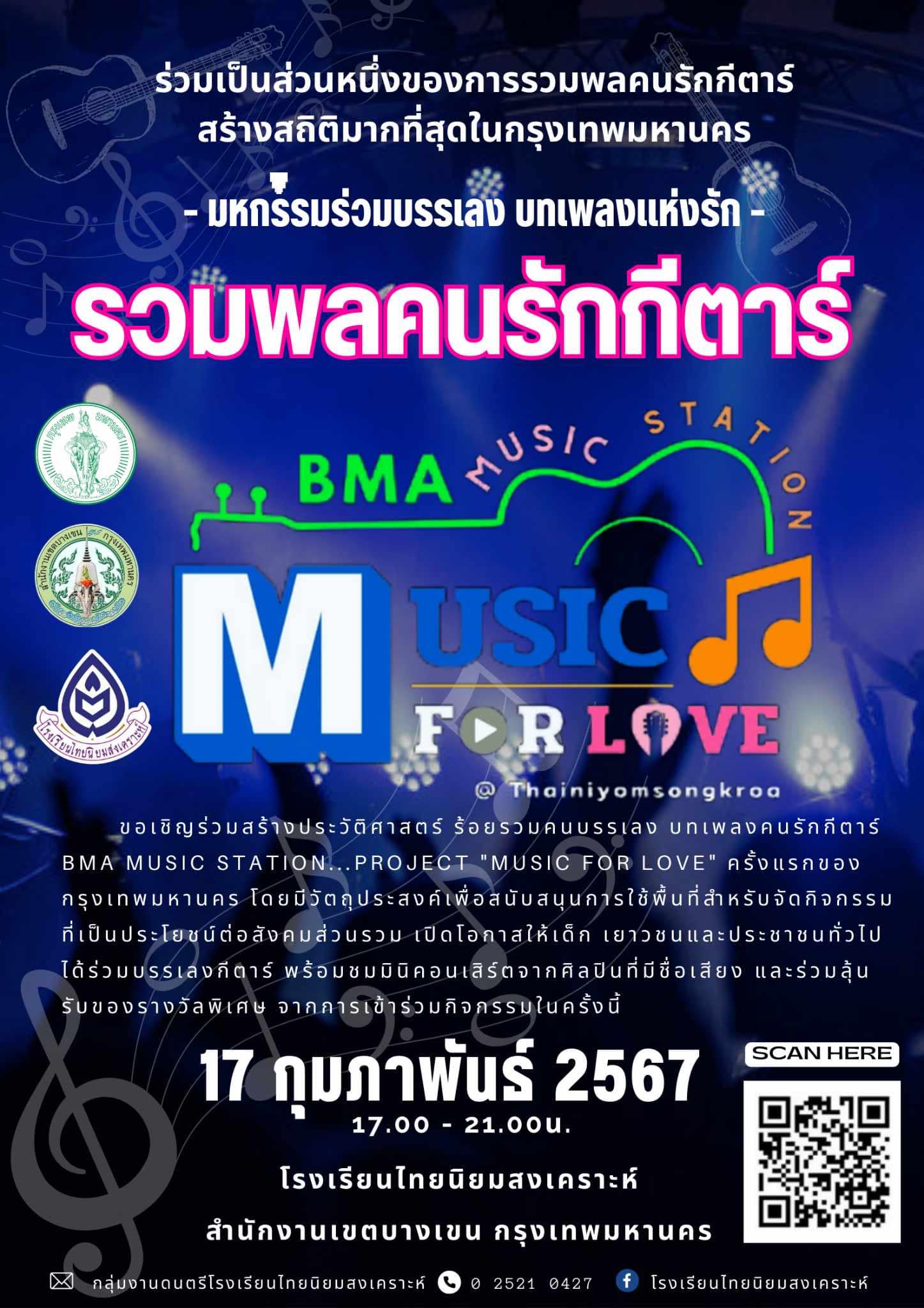 กรุงเทพมหานคร จัดมหกรรมบรรเลงกีต้าร์ บทเพลงแห่งรัก BMA Music Station Music for Love วันเสาร์ที่ 17 กุมภาพันธ์ 2567 เวลา 17.00 – 21.00 น. ณ โรงเรียนไทยนิยมสงเคราะห์ สำนักงานเขตบางเขน