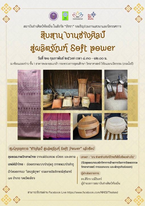 อว. ขอเชิญชวนร่วมชมงานนิทรรศการ “สืบสานงานช่างศิลป์ สู่ผลิตภัณฑ์ Soft Power”