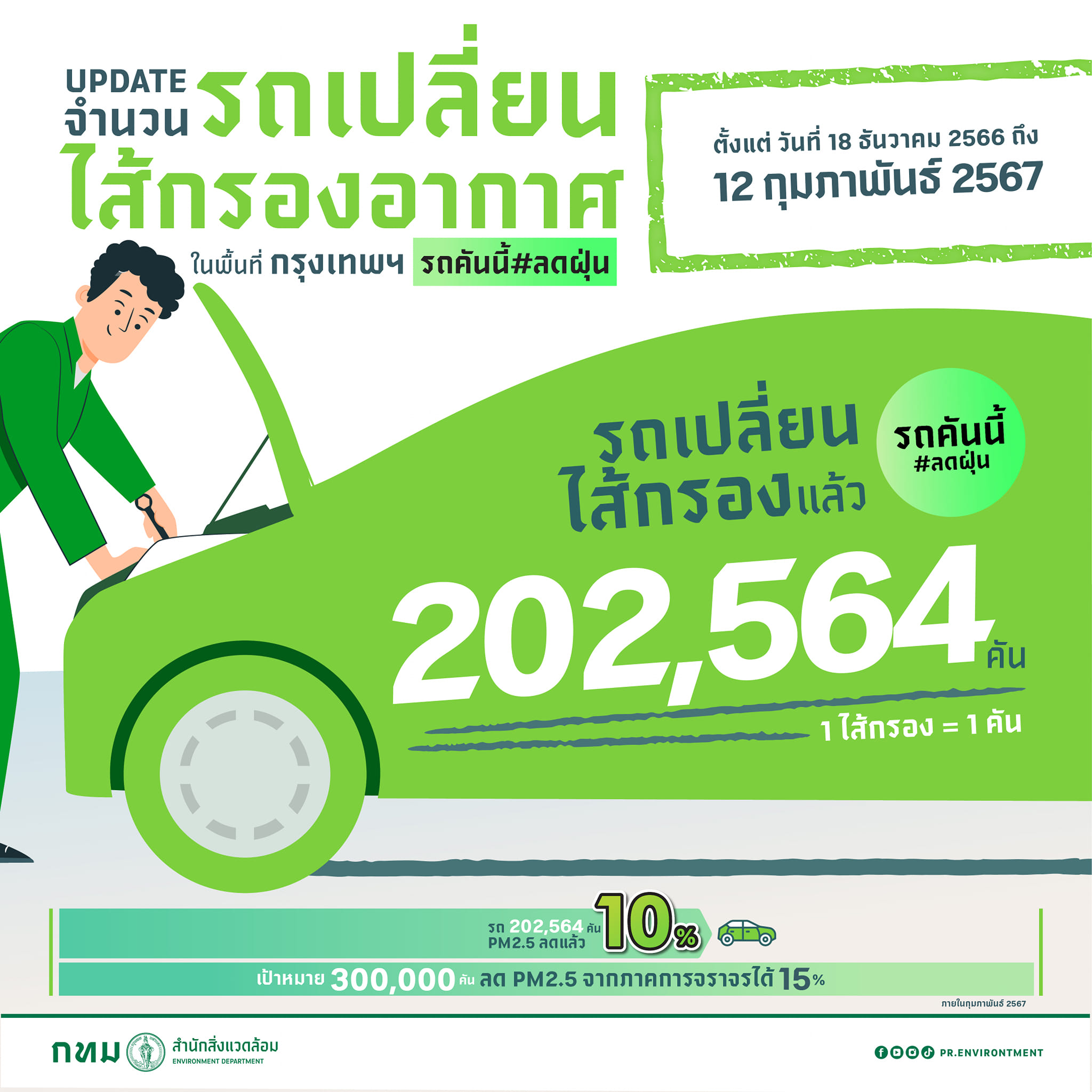 กรุงเทพมหานคร Update ข้อมูลจำนวนรถยนต์ในพื้นที่กรุงเทพฯ ที่เปลี่ยนน้ำมันเครื่องและไส้กรอง เพื่อช่วยลดฝุ่น PM 2.5 ตามโครงการ “รถคันนี้ #ลดฝุ่น” ซึ่งตั้งเป้า 3 แสนคัน ภายในเดือนกุมภาพันธ์ 2567