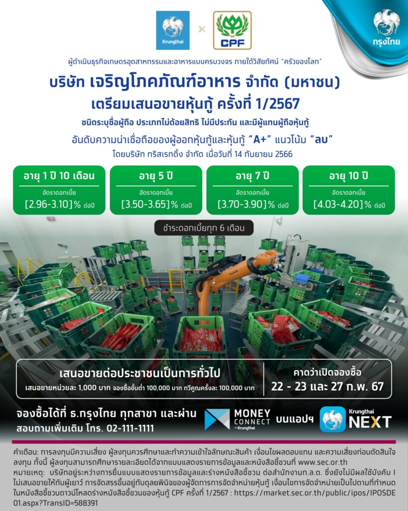 ธนาคารกรุงไทย ประกาศ บริษัท เจริญโภคภัณฑ์อาหาร จำกัด (มหาชน) หรือ “ซีพีเอฟ” (CPF) เตรียมเสนอขาย หุ้นกู้ ครั้งที่ 1/2567 ภายใต้วิสัยทัศน์ “ครัวของโลก”เตรียมเสนอขายหุ้นกู้ ชนิดระบุชื่อผู้ถือ ประเภทไม่ด้อยสิทธิ ไม่มีประกัน และมีผู้แทนผู้ถือหุ้นกู้ เปิดจองซื้อวันที่ 22 – 23 กุมภาพันธ์ และ วันที่ 27 กุมภาพันธ์ 2567 โดยจ่ายดอกเบี้ยทุก 6 เดือน เสนอขายต่อประชาชนเป็นการทั่วไป เสนอขายหน่วยละ 1,000 บาท จองซื้อขั้นต่ำ 100,000 บาท ทวีคูณครั้งละ 100,000 บาท สำหรับผู้ลงทุนรายใหญ่