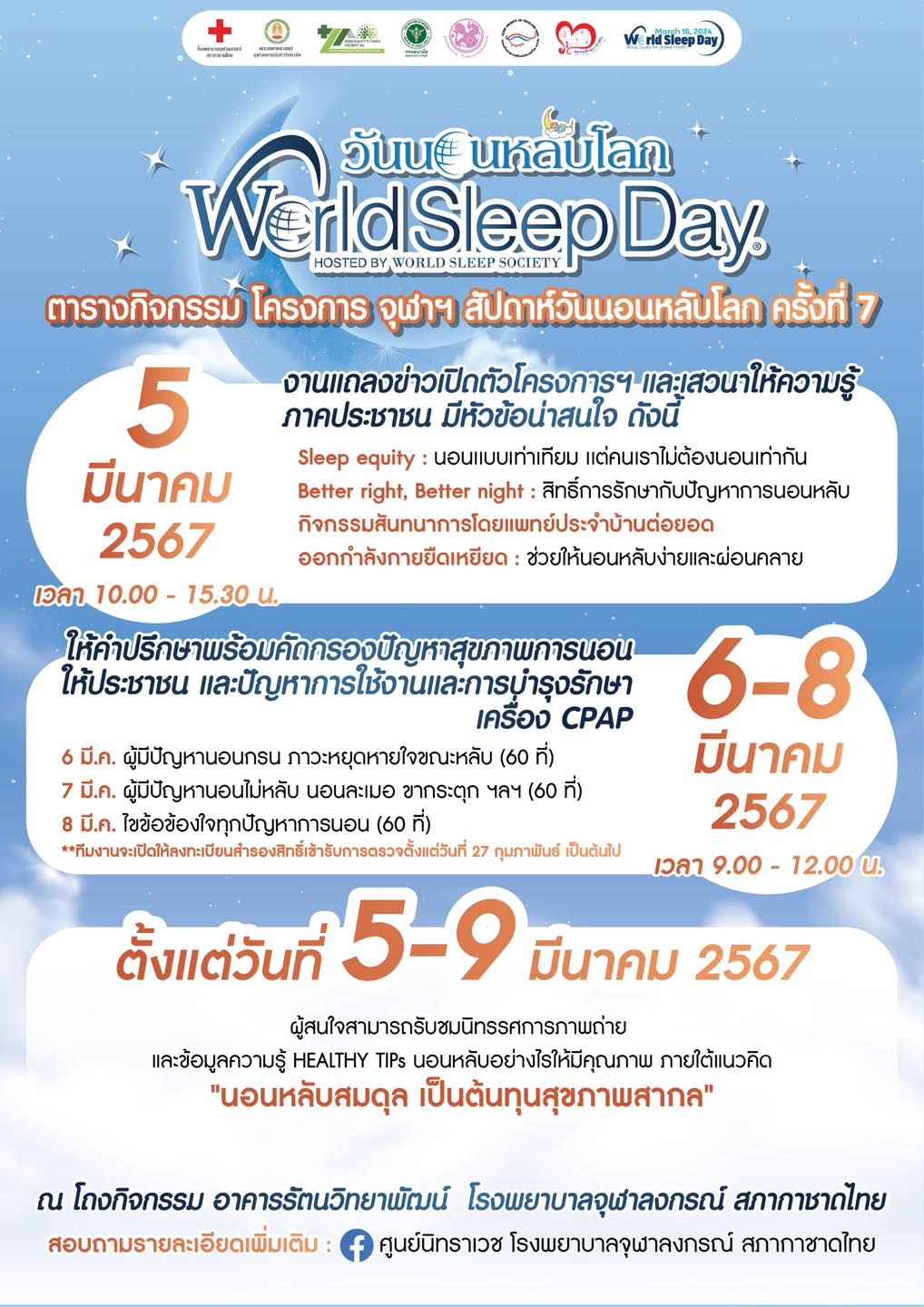 ศูนย์นิทราเวช โรงพยาบาลจุฬาลงกรณ์ สภากาชาดไทย ขอเชิญร่วมงานวันนอนหลับโลก 2024 ตั้งแต่วันที่ 5-9 มีนาคม 2567 ณ โถงกิจกรรม อาคารรัตนวิทยาพัฒน์
