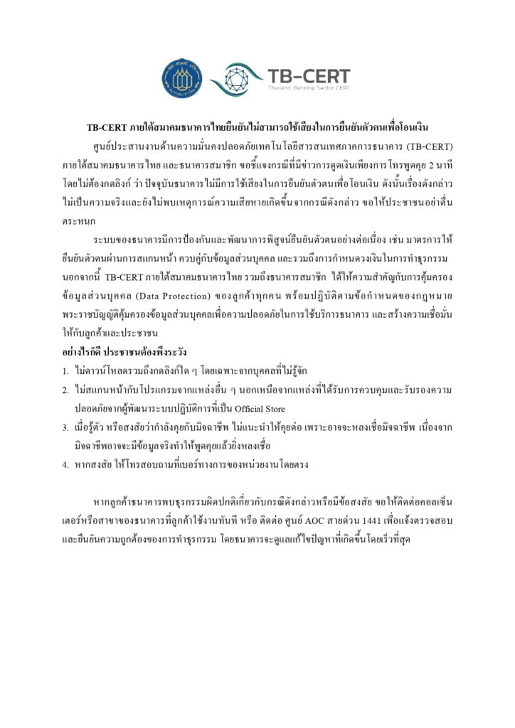 ศูนย์ประสานงานด้านความมั่นคงปลอดภัยเทคโนโลยีสารสนเทศภาคการธนาคาร (TB-CERT) ภายใต้สมาคมธนาคารไทย และธนาคารสมาชิก ขอชี้แจงกรณีที่มีข่าวการดูดเงินเพียงการโทรพูดคุย 2 นาที โดยไม่ต้องกดลิงก์ ว่า ปัจจุบันธนาคารไม่มีการใช้เสียงในการยืนยันตัวตนเพื่อโอนเงิน ดังนั้นเรื่องดังกล่าวไม่เป็นความจริง
