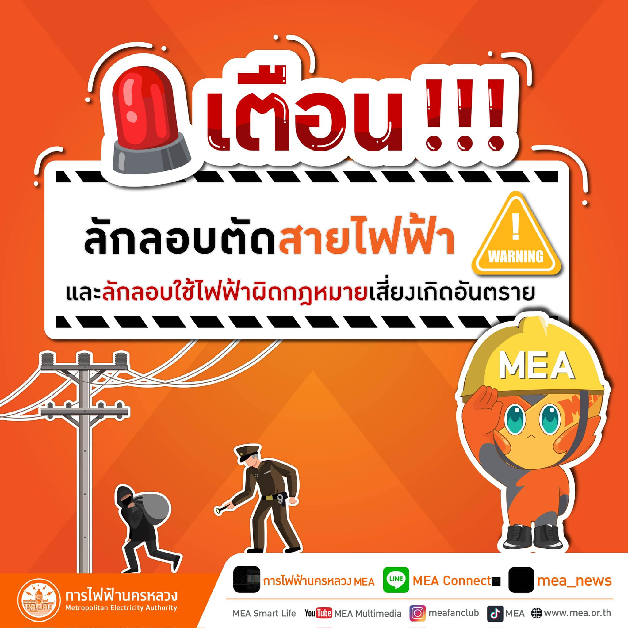 MEA หรือการไฟฟ้านครหลวง เตือนลักลอบตัดสายไฟฟ้าและลักลอบใช้ไฟฟ้าผิดกฎหมาย ไม่ปลอดภัยเสี่ยงเกิดอันตราย MEA มีการตรวจสอบอย่างต่อเนื่องและจะดำเนินคดีตามกฎหมายกับผู้ที่ลักลอบตัดสายไฟฟ้าและลักลอบใช้ไฟฟ้าทุกราย โดยจะประสานความร่วมมือกับเจ้าหน้าที่ตำรวจ และหน่วยงานที่เกี่ยวข้องตรวจสอบเพิ่มเติมในสถานที่เป้าหมายที่เข้าข่ายต้องสงสัยในพื้นที่ให้บริการของ MEA กรุงเทพมหานคร นนทบุรี และสมุทรปราการ ทั้งนี้ MEA ขอขอบคุณประชาชนที่ช่วยกันดูแลสอดส่อง และรายงานเบาะแสการละเมิดทรัพย์สินสาธารณะ เพื่อความปลอดภัยของส่วนรวม