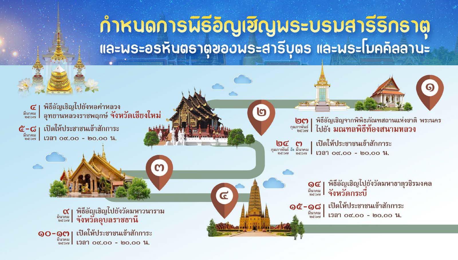 - วันที่ 23 กุมภาพันธ์ 2567 เวลา 17.00 น. อัญเชิญพระบรมสารีริกธาตุ และพระอรหันตธาตุฯ จากพิพิธภัณฑสถานแห่งชาติ พระนคร ไปประดิษฐาน ณ มณฑลพิธีท้องสนามหลวง