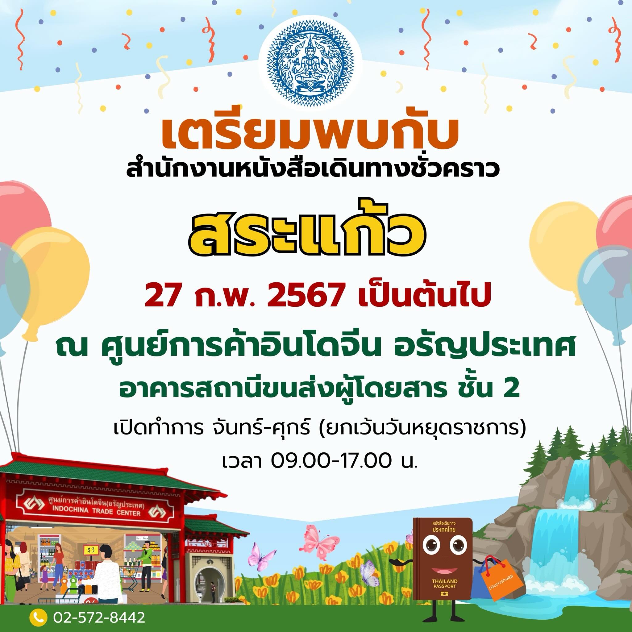 ประกาศกรมการกงสุล เตรียมเปิดสำนักงานหนังสือเดินทางชั่วคราว สระแก้ว แห่งใหม่ ในวันอังคารที่ 27 กุมภาพันธ์ 25467 ณ ศูนย์การค้าอินโดจีน อรัญประเทศ อาคารสถานีขนส่ง ผู้โดยสาร ชั้น 2 เปิดทำการวัน จันทร์ – ศุกร์ (ยกเว้นวันหยุดราชการและวันหยุดนักขัตฤกษ์) เวลา 09.00-17.00 น.