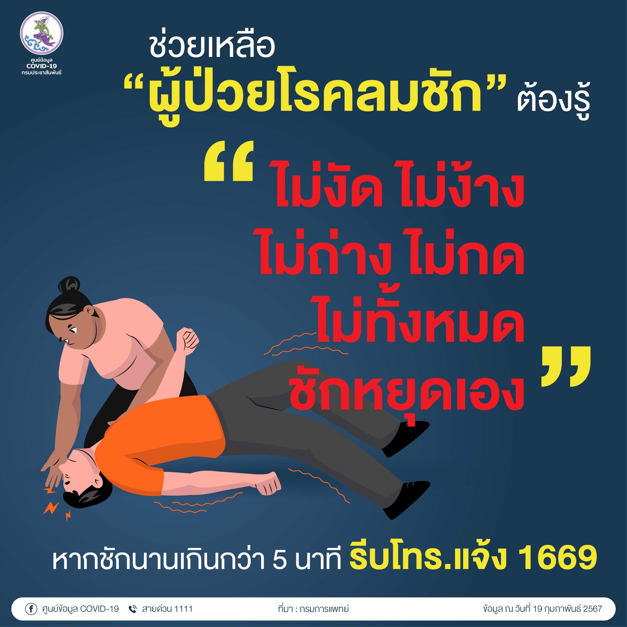 กรมการแพทย์ แนะนำการช่วยเหลือ “ผู้ป่วยโรคลมชัก” ต้องรู้ “ไม่งัด ไม่ง้าง ไม่ถ่าง ไม่กด ไม่ทั้งหมด ชักหยุดเอง” หากชักนานเกินกว่า 5 นาที รีบโทร.แจ้ง 1669
