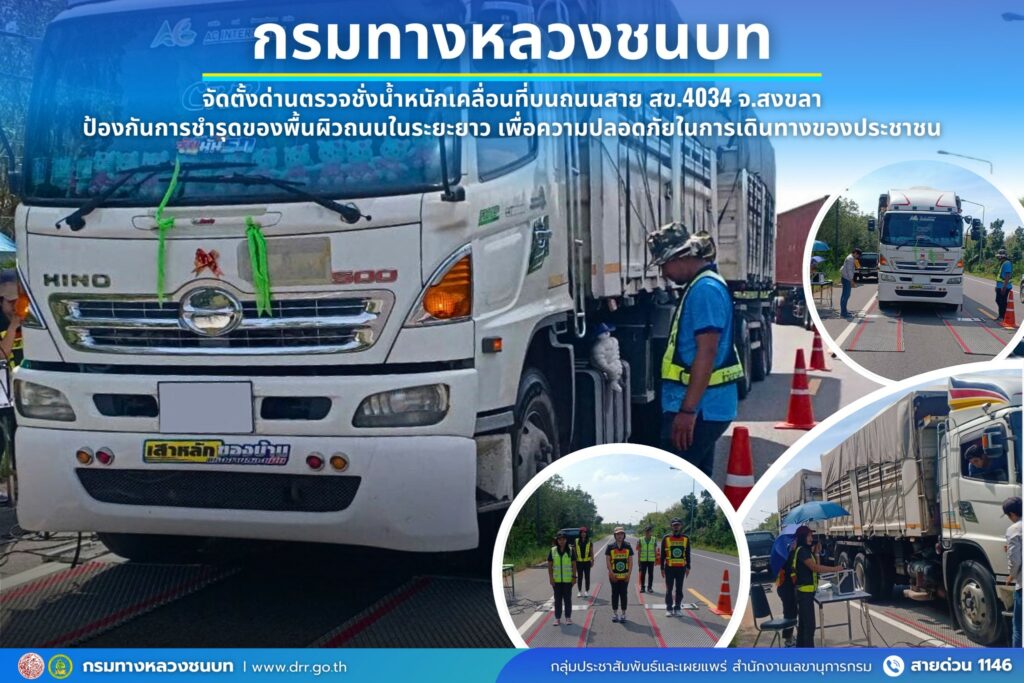 กรมทางหลวงชนบท โดยแขวงทางหลวงชนบทสงขลา จัดตั้งด่านตรวจชั่งน้ำหนักแบบเคลื่อนที่บนถนนทางหลวงชนบทสาย สข.4034 บริเวณแยกทล.4145 – บ้านโคกม่วง อำเภอสะเดา, คลองหอยโข่ง จังหวัดวงขลา เพื่อตรวจสอบและควบคุมน้ำหนักของรถบรรทุกไม่ให้น้ำหนักเกินกว่าที่กฎหมายกำหนด เป็นการป้องกันการชำรุดของพื้นผิวถนนในระยะยาว ซึ่งหากฝ่าฝืนจะมีโทษจำคุกไม่เกิน 6 เดือน หรือปรับไม่เกิน 10,000 บาท หรือทั้งจำทั้งปรับ และอาจถูกริบรถบรรทุกที่ใช้ในการกระทำความผิดนั้นด้วย หากประชาชนพบเห็นรถบรรทุกน้ำหนักเกินสามารถแจ้งเหตุได้ที่สายด่วนกรมทางหลวงชนบท โทร. 1146