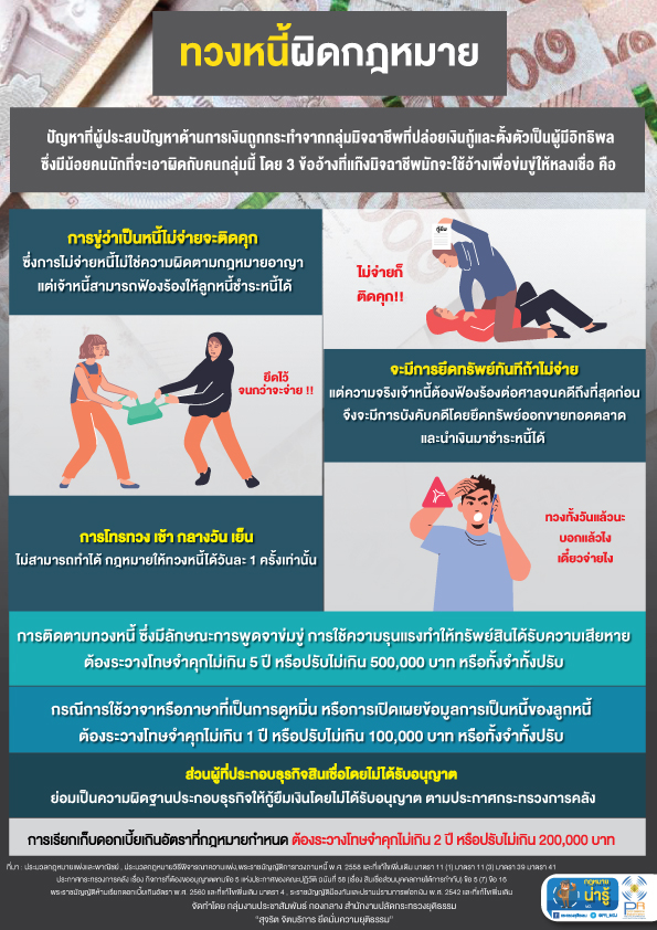 • การขู่ว่าเป็นหนี้ไม่จ่ายจะติดคุก ซึ่งการไม่จ่ายหนี้ไม่ใช่ความผิดตามกฎหมายอาญา แต่เจ้าหนี้สามารถฟ้องร้องให้ลูกหนี้ชำระหนี้ได้