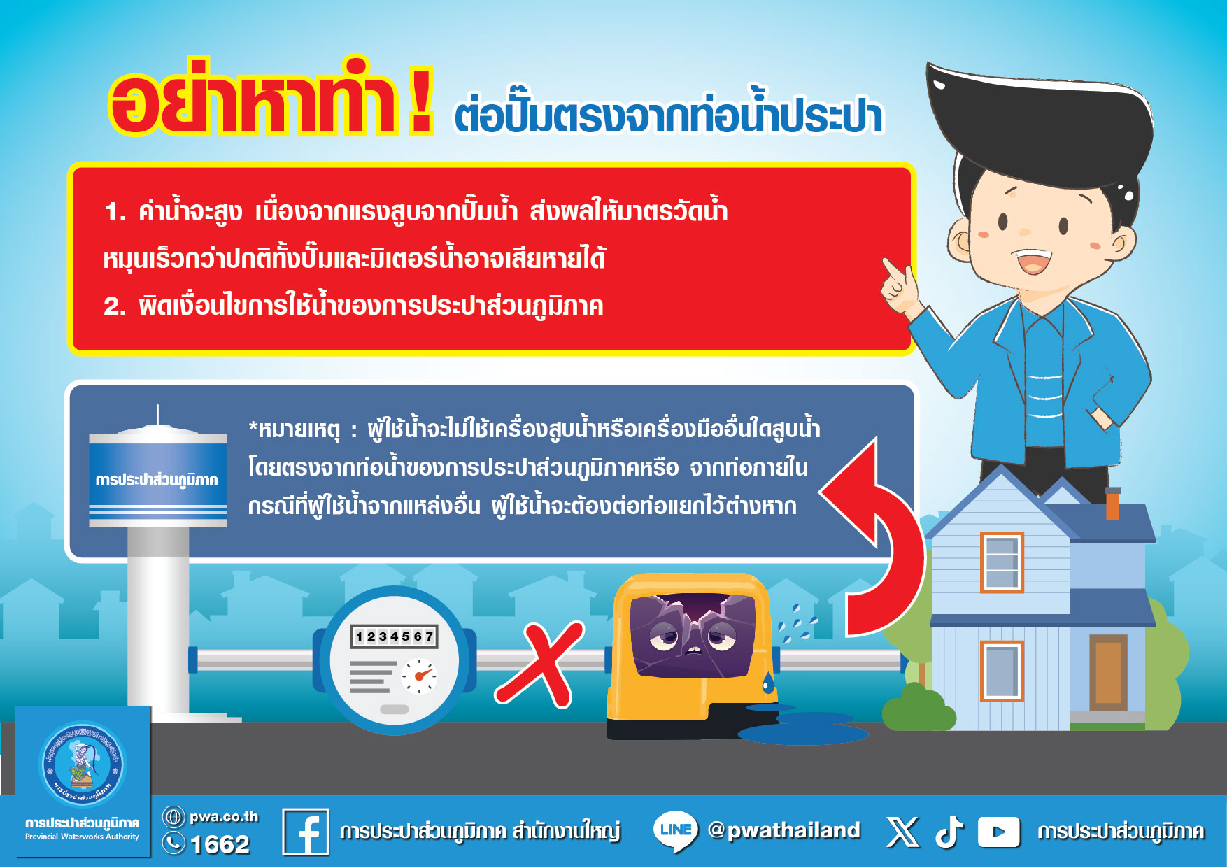 การประปาส่วนภูมิภาค แนะนำข้อควรรู้ ห้ามต่อปั๊มน้ำตรงจากท่อประปา ข่าวสารกิจกรรม การประปาส่วนภูมิภาค แนะนำข้อควรรู้ ห้ามต่อปั๊มน้ำตรงจากท่อประปา การประปาส่วนภูมิภาค แนะนำข้อควรรู้ ห้ามต่อปั๊มน้ำตรงจากท่อประปา1. ค่าน้ำจะสูง เนื่องจากแรงสูบจากปั๊มน้ำ ส่งผลให้มาตรวัดน้ำหมุนเร็วกว่าปกติ ทั้งปั๊มน้ำและมิเตอร์น้ำอาจเสียหายได้2. ผิดเงื่อนไขการใช้น้ำของการประปาส่วนภูมิภาคที่มา : https://citly.me/M19Sv Post Views: 276 FacebookFacebookXTwitterLINELine