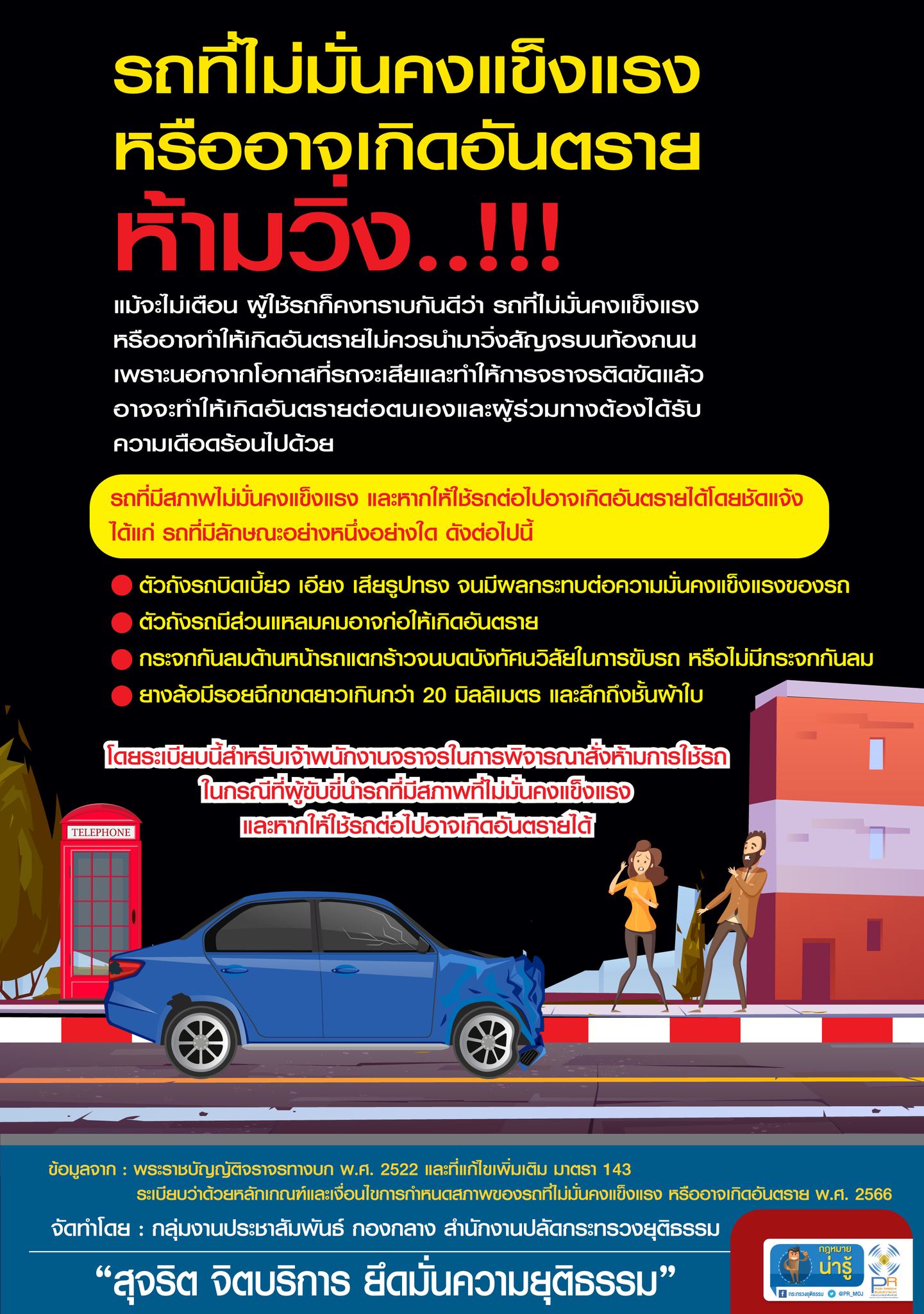 ข้อมูลจาก : พระราชบัญญัติจราจรทางบก พ.ศ. 2522 และที่แก้ไขเพิ่มเติม มาตรา 143 ระเบียบว่าด้วยหลักเกณฑ์และเงื่อนไขการกำหนดสภาพของรถที่ไม่มั่นคงแข็งแรง หรืออาจเกิดอันตราย พ.ศ. 2566