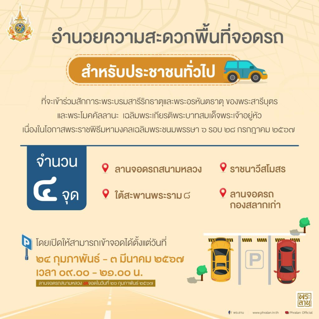 สำนักพระราชวัง อำนวยความสะดวกพื้นที่จอดรถสำหรับประชาชนทั่วไปที่จะเข้าร่วมสักการะพระบรมสารีริกธาตุและพระอรหันตธาตุของพระสารีบุตรและพระโมคคัลลานะ