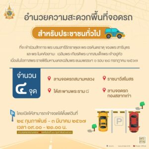 โดยเปิดให้สามารถเข้าจอดได้ตั้งแต่วันที่ 24 กุมภาพันธ์ – 3 มีนาคม 2567 เวลา 09.00 – 21.00 น. [ลานจอดรถสนามหลวง งดจอดในวันที่ 26 กุมภาพันธ์ 2567]
