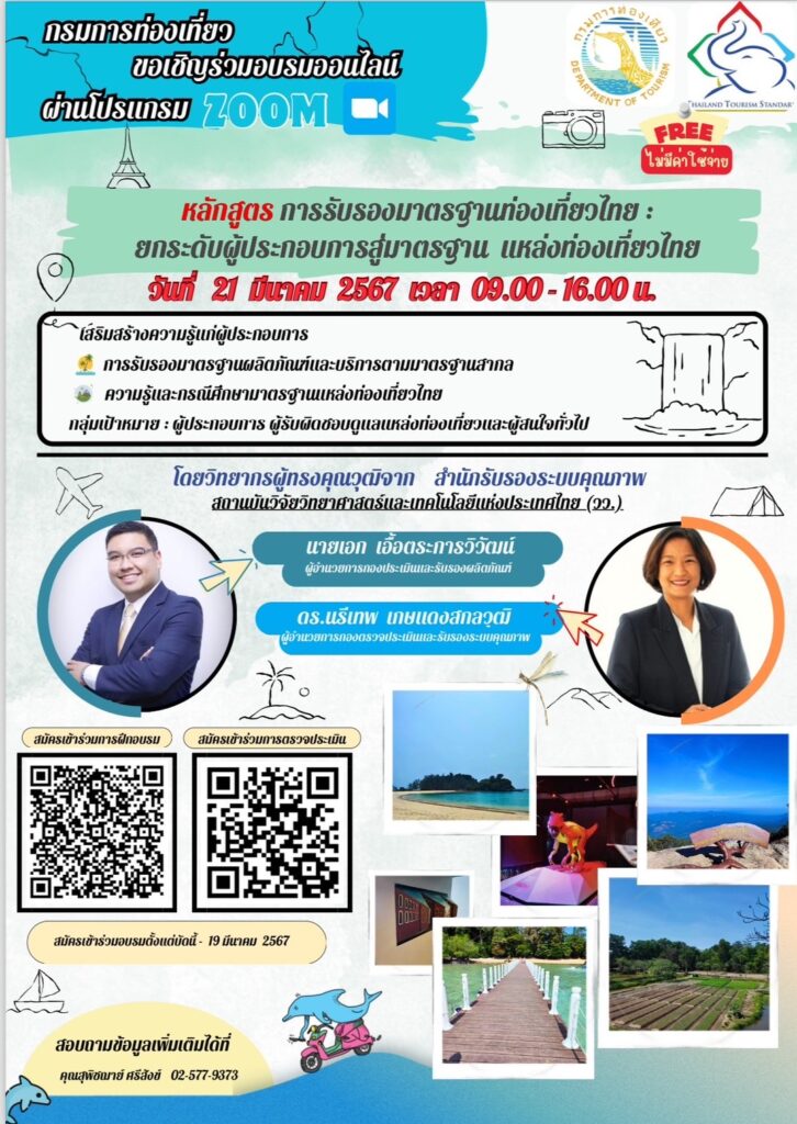 กรมการท่องเที่ยว โดยกองพัฒนาแหล่งท่องเที่ยว ขอเชิญผู้ประกอบการ สถานประกอบการแหล่งท่องเที่ยว หรือผู้ที่สนใจเข้าร่วมการอบรมออนไลน์ผ่านระบบ ZOOM ใน หลักสูตร “การรับรองมาตรฐานการท่องเที่ยวไทย : ยกระดับผู้ประกอบการสู่มาตรฐานคุณภาพแหล่งท่องเที่ยว” โดยวิทยากรผู้ทรงคุณวุฒิจาก สำนักรับรองระบบคุณภาพ สถาบันวิจัยวิทยาศาสตร์และเทคโนโลยีแห่งประเทศไทย (วว.) วันที่ 21 มีนาคม 2567 เวลา 09.00 – 16.00 น. โดยสแกน QR Code เพื่อสมัครเข้าอบรมได้ ตั้งแต่บัดนี้ – 19 มีนาคม 2567 สอบถามข้อมูลเพิ่มเติมที่ โทร. 02 577 9373