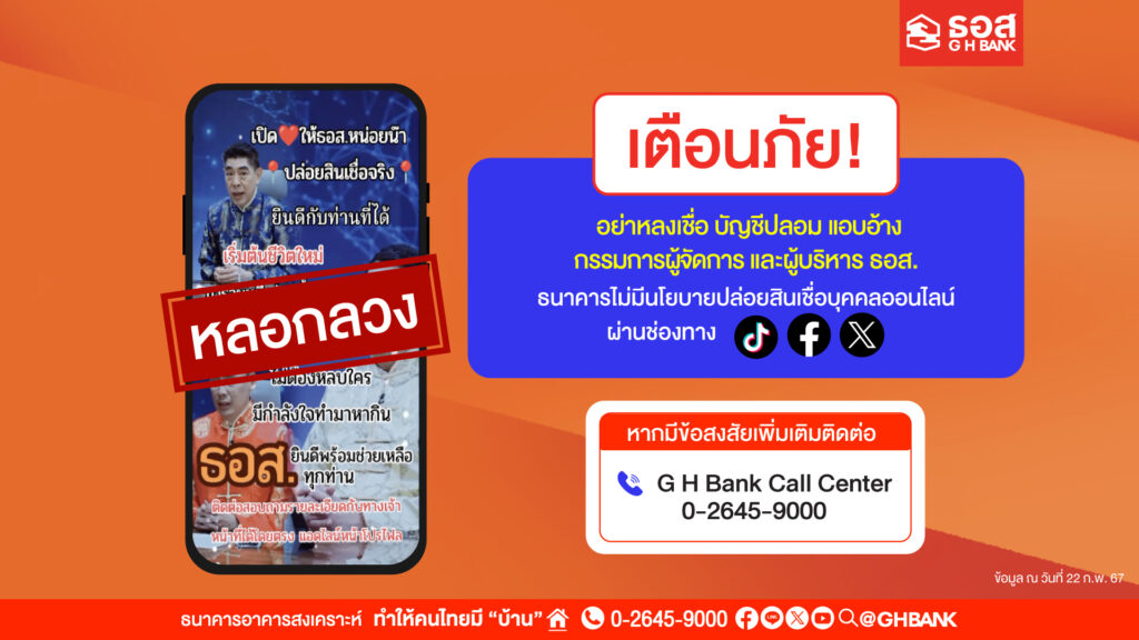 ธนาคารอาคารสงเคราะห์ (ธอส.) ขอแจ้งเตือนภัยกรณีมีมิจฉาชีพนำตราสัญลักษณ์ของธนาคารและปลอม Account ในสื่อโซเชียล โดยใช้ภาพของนายกมลภพ วีระพละ กรรมการผู้จัดการ ธอส. เพื่อแอบอ้างปล่อยสินเชื่อบุคคลออนไลน์จากธนาคาร โดย ธอส. ขอยืนยันว่า ธนาคารและกรรมการผู้จัดการ ไม่มีส่วนเกี่ยวข้องกับ Account ปลอมดังกล่าว รวมถึงการแอบอ้างในสื่อโซเชียลต่าง ๆ ที่อาจใช้รูปภาพและกระทำในลักษณะเดียวกัน เพื่อหลอกลวงเอาเงินจากประชาชน ซึ่ง ธอส.อยู่ระหว่างดำเนินการทางกฎหมายกับกลุ่มมิจฉาชีพที่แอบอ้างแล้ว และขอให้ประชาชนอย่าหลงเชื่อกลโกงของมิจฉาชีพอย่างเด็ดขาด พร้อมขอความร่วมมือไม่ส่งหรือแชร์ต่อในช่องทางสื่อสังคมออนไลน์ต่างๆ และเพื่อให้ประชาชนได้รับข้อมูลข่าวสารจากธนาคารอาคารสงเคราะห์ได้อย่างครบถ้วน สามารถติดตามได้ที่ www.ghbank.co.th หรือ G H Bank Call Center โทร 0-2645-9000 และ Facebook Fanpage ธนาคารอาคารสงเคราะห์