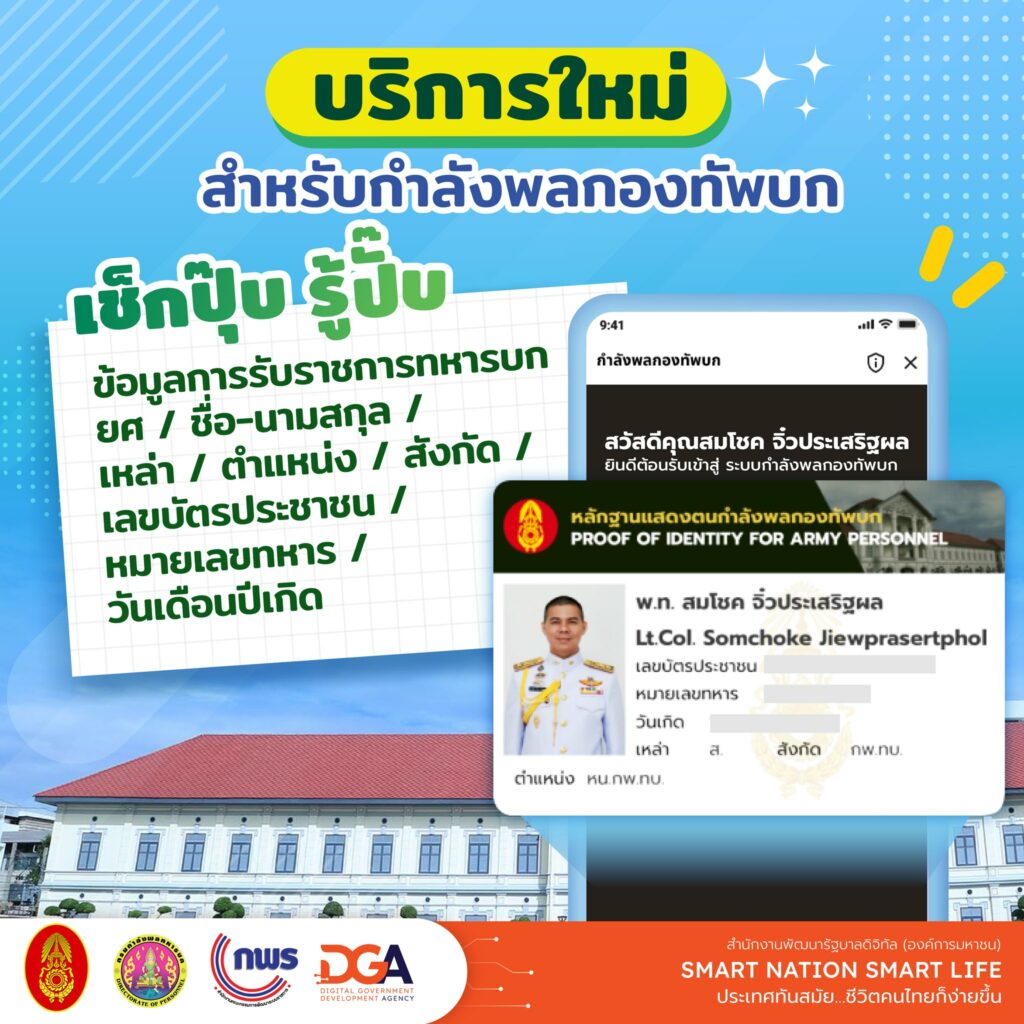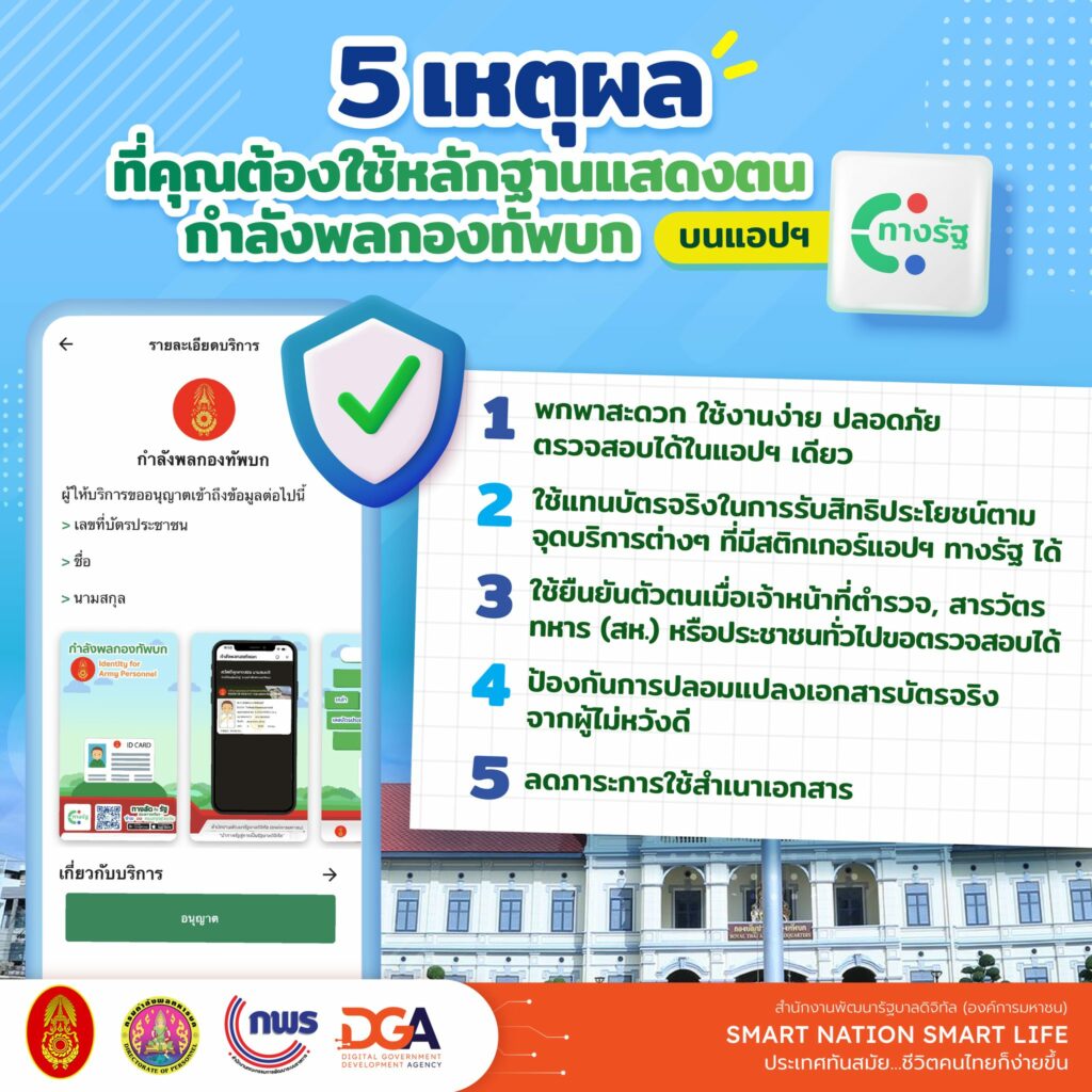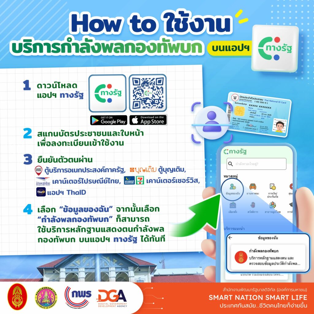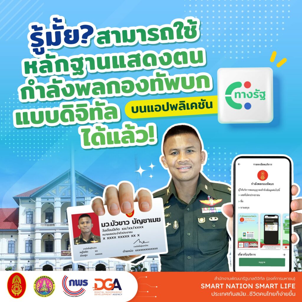 สำนักงานพัฒนารัฐบาลดิจิทัล แจ้งสามารถใช้หลักฐานแสดงตนกำลังพลกองทัพบกแบบดิจิทัลบนแอปพลิเคชั่น “ทางรัฐ” ได้แล้ว