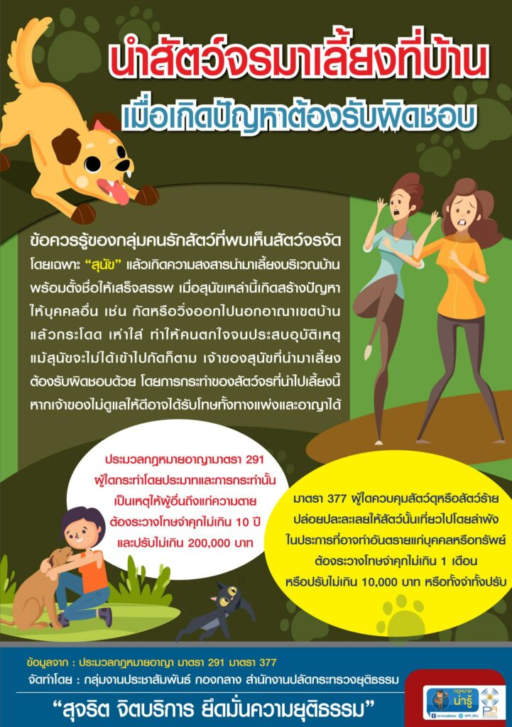 กระทรวงยุติธรรม แนะนำกฎหมายน่ารู้ ชื่อตอน : นำสัตว์จรมาเลี้ยงที่บ้าน เมื่อเกิดปัญหาต้องรับผิดชอบ