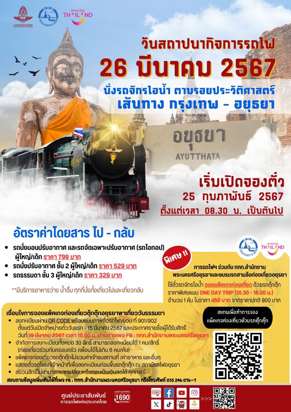 ขณะเดียวกัน ในโอกาสนี้ การรถไฟฯ ยังได้ร่วมกับ ททท.สำนักงานพระนครศรีอยุธยา จัดกิจกรรมท่องเที่ยวด้วยตุ๊กตุ๊ก ราคาพิเศษแบบ One Day Trip ให้กับนักท่องเที่ยวที่ร่วมเดินทางกับขบวนรถพิเศษนำเที่ยวรถจักรไอน้ำ ขบวนที่ 901/902 เส้นทางประวัติศาสตร์ กรุงเทพ–อยุธยา ในวันที่ 26 มีนาคม 2567 โดยมอบราคาพิเศษให้กับนักท่องเที่ยว จากราคาปกติ 900 บาท ราคาพิเศษ 450 บาท ซึ่งนักท่องเที่ยวสามารถเดินทางท่องเที่ยวสถานที่สำคัญของจังหวัดพระนครศรีอยุธยาได้กว่า 10 แห่ง ตั้งแต่เวลา 10.30 น. – 16.30 น. ผู้สนใจสามารถลงทะเบียนผ่าน QR Code พร้อมแนบหลักฐานตั๋วโดยสารขบวนดังกล่าว สอบถามข้อมูลเพิ่มเติมที่ การท่องเที่ยวแห่งประเทศไทย สำนักงานพระนครศรีอยุธยา หมายเลขโทรศัพท์ 035 246 076-7