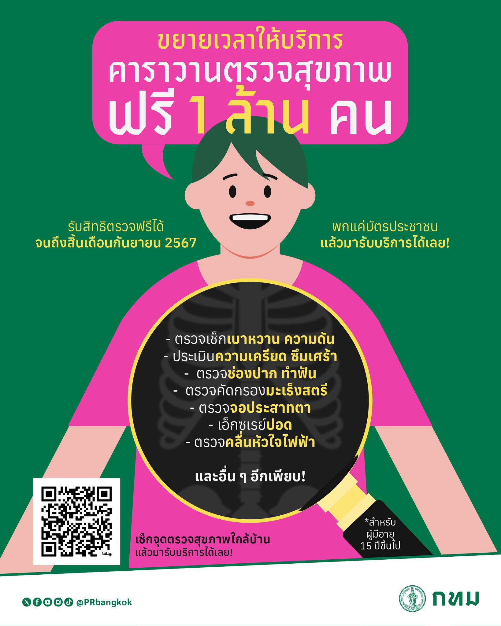 หลังจากเดินหน้าโครงการตรวจสุขภาพเชิงรุกเมื่อวันที่ 24 ธันวาคม 2566 ที่ผ่านมา มีประชาชนมารับบริการตรวจสุขภาพฟรีจากหน่วยตรวจของ กทม. แล้วมากกว่า 7 หมื่นคน เพื่อให้บริการไปถึงประชาชนทุกกลุ่ม กทม. จึงได้ขยายการให้บริการต่อเนื่องไปถึงสิ้นเดือนกันยายน 2567 และเพิ่มจุดให้บริการในรูปแบบของ ‘คาราวานตรวจสุขภาพ’ หรือ ‘Health Market’ โดยได้เพิ่มจุดตรวจในห้างสรรพสินค้า คอมมูนิตี้มอลล์ และตลาดเพื่อให้ประชาชนได้รับบริการอย่างทั่วถึง