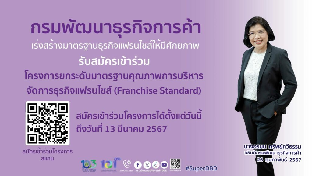 กรมพัฒนาธุรกิจการค้า เตรียมอัปเกรดผู้ประกอบธุรกิจแฟรนไชส์ เร่งสร้างมาตรฐานธุรกิจแฟรนไชส์ให้มีศักยภาพพร้อมสร้างเครือข่ายกับนักลงทุนทั้งในและต่างประเทศในการขยายตลาด ตลอดจนสามารถสร้างมูลค่าทางเศรษฐกิจให้แก่ประเทศเพิ่มขึ้น เปิดรับสมัครผู้ประกอบธุรกิจแฟรนไชส์ที่สนใจเข้าร่วมโครงการยกระดับมาตรฐานคุณภาพการบริหารจัดการธุรกิจแฟรนไชส์ (Franchise Standard) ประจำปี 2567 ตั้งแต่บัดนี้จนถึงวันที่ 13 มีนาคม 2567