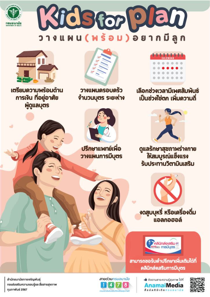 • กรมอนามัย ขอแนะนำแนวทางการวางแผนเตรียมความพร้อมให้กับคู่รักที่ต้องการมีลูก ไว้เป็นตัวเลือกในการตัดสินใจกับ Kids for Plan วางแผน (พร้อม) อยากมีลูก ดังนี้