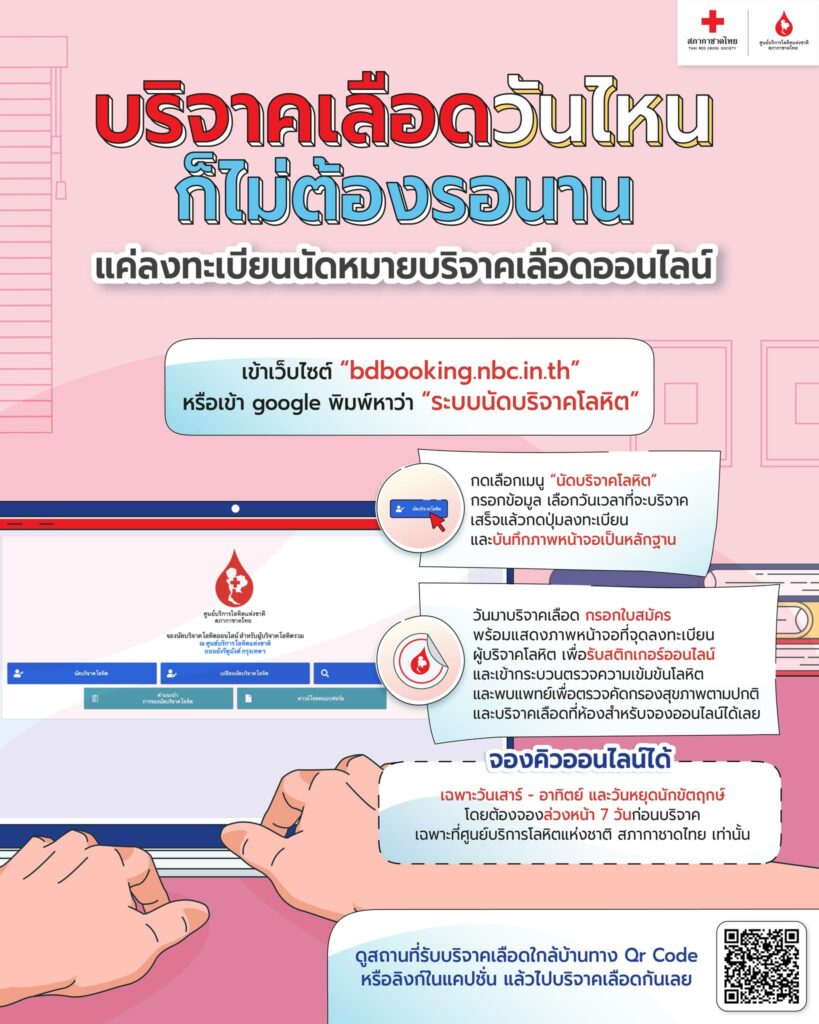 • สภากาชาดไทย เปิดให้จองคิดบริจาคเลือดแบบออนไลน์ เฉพาะศูนย์บริการโลหิตแห่งชาติ ถนนอังรีดูนังต์