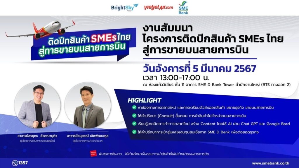 ธนาคารพัฒนาวิสาหกิจขนาดกลางและขนาดย่อมแห่งประเทศไทย ร่วมกับ บริษัท ไบรท์สกาย เอวิเอชั่น จำกัด หรือ “Sky Vibe” เปิดโอกาสให้ผู้ประกอบการเอสเอ็มอีไทยนำสินค้าวางจำหน่ายบนสายการบิน “ไทยเวียตเจ็ท แอร์” โดยการจัดสัมมนาโครงการ “ติดปีกสินค้า SMEs ไทย สู่การขายบนสายการบิน” ในวันที่ 5 มีนาคม 2567 เวลา 13.00-18.00 น. ณ ห้องประชุมแก้ววิเชียร ชั้น 11 อาคาร SME Bank Tower สำนักงานใหญ่ SME D Bank อาทิ แนะนำขั้นตอนการนำสินค้าจำหน่ายบนสายการบิน เทคนิคการทำตลาดโดยใช้ AI ผ่าน Chat GPT และ Google Bard การเตรียมพร้อมเข้าถึงแหล่งทุน สามารถดูรายละเอียด และสมัครแจ้งความประสงค์ได้ที่แพลตฟอร์ม DX (dx.smebank.co.th) สอบถามข้อมูลเพิ่มเติมที่ Call Center 1357