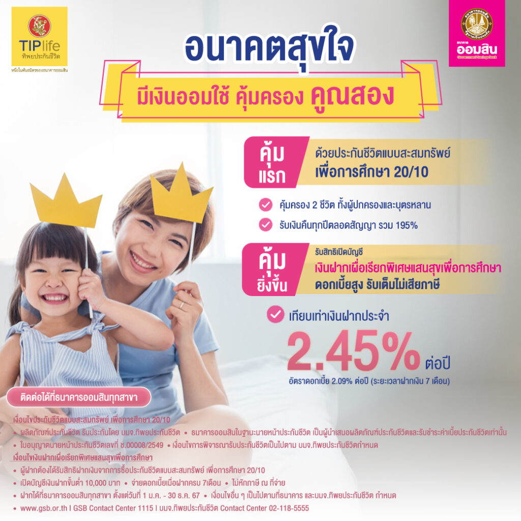 ธนาคารออมสิน จัดเต็มความคุ้มคูณสอง คุ้มครองด้วยประกันชีวิตแบบสะสมทรัพย์ เพื่อการศึกษา