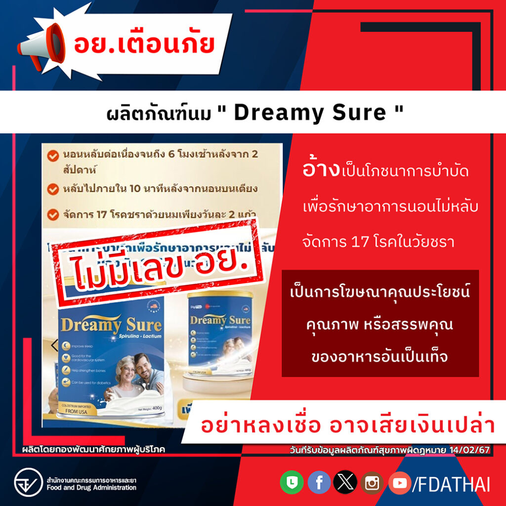 อย.เตือนผลิตภัณฑ์นม Dreamy Sure “นมช่วยนอนหลับ Dreamy Sure” และ “โภชนาการบำบัดเพื่อรักษาอาการนอนไม่หลับ” “นอนหลับต่อเนื่อง จนถึง 6 โมงเช้าหลังจาก 2 สัปดาห์ หลับไปภายใน 10 นาทีหลังจากนอนบนเตียง จัดการ 17 โรคชราด้วยนมเพียงวันละ 2 แก้ว” อย.ตรวจสอบแล้วพบเป็นการโฆษณาคุณประโยชน์ คุณภาพ หรือ สรรพคุณของอาหาร อันเป็นเท็จหรือหลอกลวงให้เกิดความหลงเชื่อโดยไม่สมควร เตือนอย่าหลงเชื่อ อาจเสียเงินเปล่า