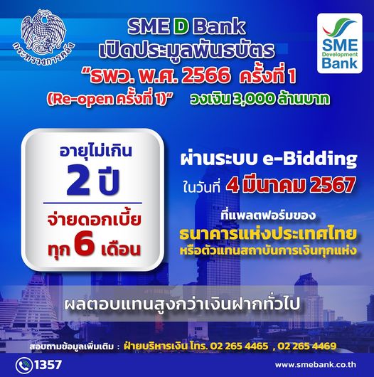 โดยพันธบัตรรุ่น “ธพว. พ.ศ.2566 ครั้งที่ 1 (Re-open ครั้งที่ 1)” อายุ 2 ปี ครบกำหนดปี 2569 จ่ายดอกเบี้ยทุก 6 เดือน อัตราผลตอบแทนสูงกว่าเงินฝากทั่วไป เปิดโอกาสให้นักลงทุนผู้สนใจทุกกลุ่ม ทั้งนี้ กำหนดเปิดประมูลด้วยระบบ e-Bidding ในวันที่ 4 มีนาคม 2567 ผ่านแพลตฟอร์มของธนาคารแห่งประเทศไทย หรือผ่านตัวแทนสถาบันการเงินทุกแห่ง สอบถามข้อมูลเพิ่มเติม : ฝ่ายบริหารเงิน โทร. 02 265 4465 , 02 265 4469 หรือ Call Center 1357