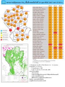 - ภาคตะวันออกเฉียงเหนือ เกินค่ามาตรฐาน 7 พื้นที่ ตรวจวัดได้ 22.1 – 67.5 ไมโครกรัมต่อลูกบาศก์เมตร