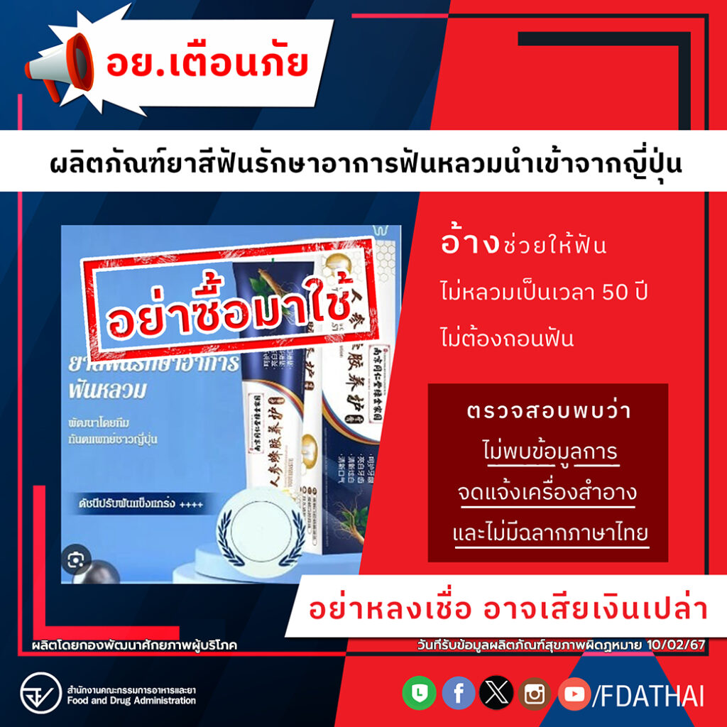 สำนักงานคณะกรรมการอาหารและยา แจ้งเตือนภัย ผลิตภัณฑ์ยาสีฟันรักษาอาการฟันหลวมนำเข้าจากญี่ปุ่น โดยแอบอ้างช่วยให้ฟันไม่หลวมเป็นเวลา 50 ปี ไม่ต้องถอนฟัน ทั้งนี้ ทาง อย. ได้ตรวจสอบแล้วพบว่าไม่พบข้อมูลการจดแจ้งเครื่องสำอางและไม่มีฉลากภาษาไทย จึงย้ำเตือนอย่าหลงเชื่อ ซื้อมาใช้ อาจเสียเงินเปล่า