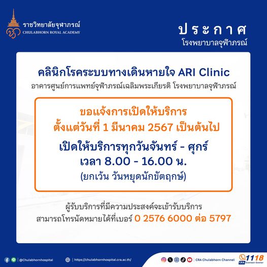 ประกาศ โรงพยาบาลจุฬาภรณ์ คลินิกโรคระบบทางเดินหายใจ ARI Clinic อาคารศูนย์การแพทย์จุฬาภรณ์เฉลิมพระเกียรติ โรงพยาบาลจุฬาภรณ์ ขอแจ้งการเปิดให้บริการ ตั้งแต่วันที่ 1 มีนาคม 2567 เป็นต้นไป