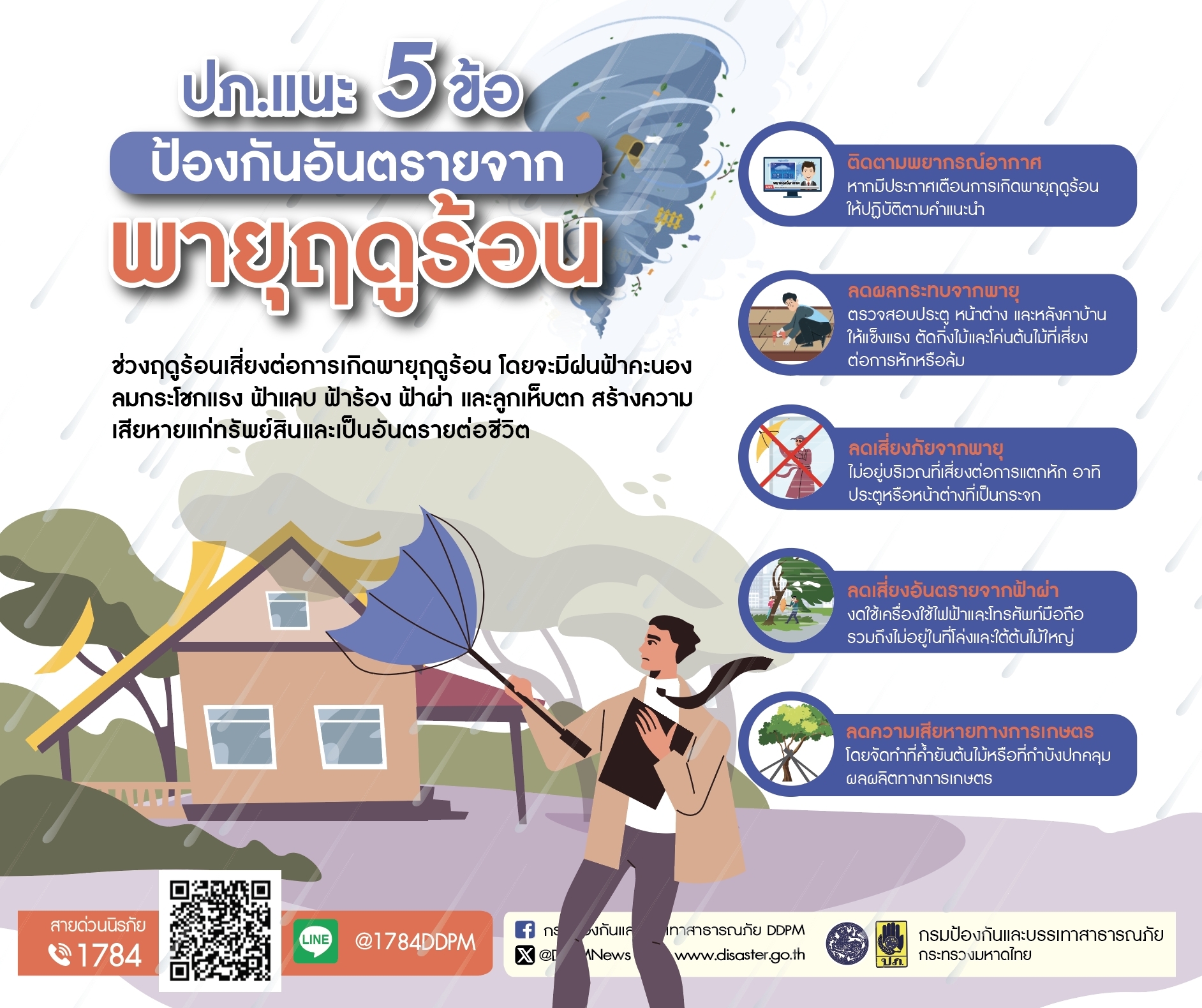 กรมป้องกันและบรรเทาสาธารณภัย (ปภ.) แนะนำประชาชนเตรียมรับมือป้องกันพายุลมกระโชกแรง ตรวจสอบจุดต่าง ๆ ของบ้านเรือน ป้ายโฆษณา ต้นไม้สูง ให้อยู่ในสภาพมั่นคงแข็งแรง และเก็บสิ่งของบริเวณบ้านที่อาจถูกลมพัดปลิวให้มิดชิด พร้อมจดจำหมายเลขโทรศัพท์ของหน่วยงานที่สามารถให้ความช่วยเหลือเมื่อประสบภัย