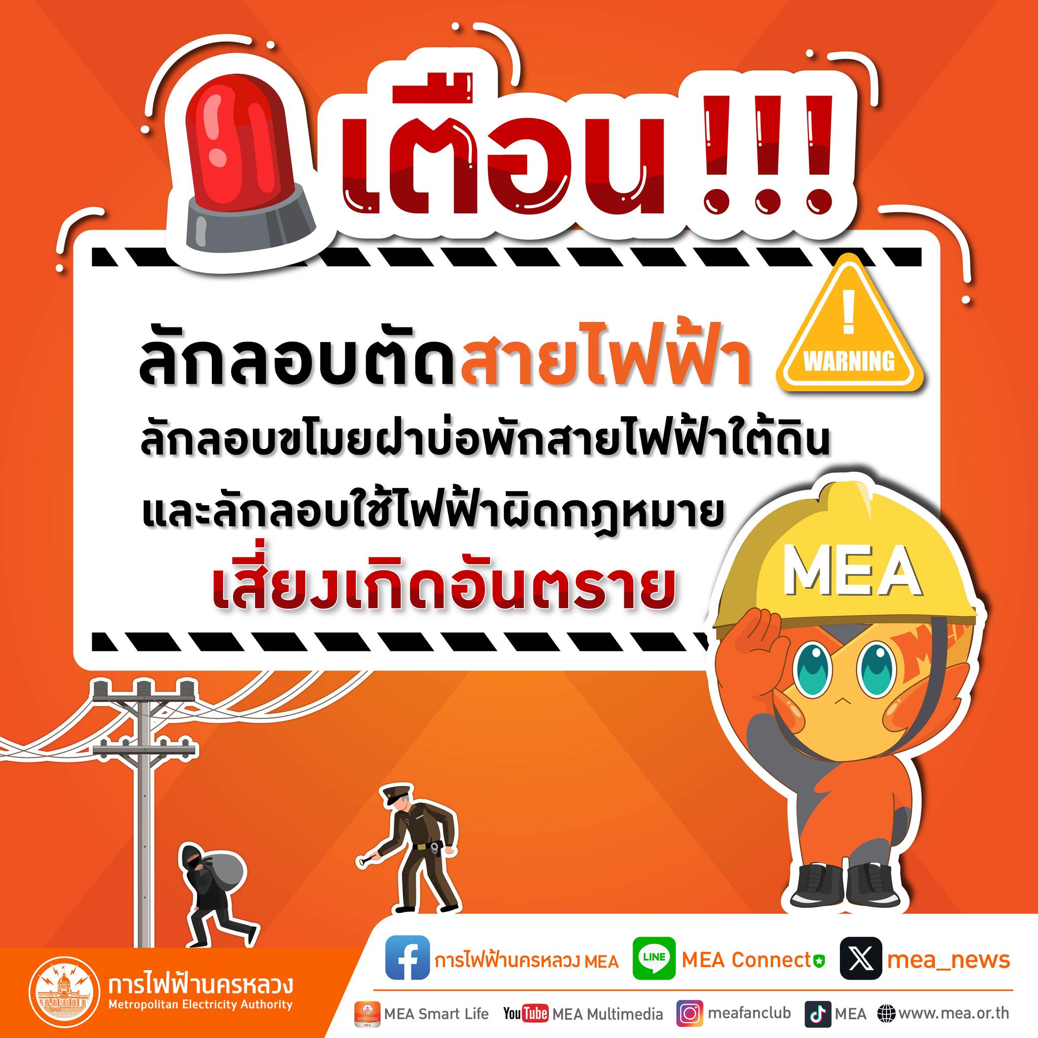 MEA หรือการไฟฟ้านครหลวง เตือนลักลอบตัดสายไฟฟ้า ลักลอบขโมยฝาบ่อพักชั่วคราวที่ใช้วางท่อร้อยสายไฟฟ้าใต้ดิน และลักลอบใช้ไฟฟ้าผิดกฎหมาย ไม่ปลอดภัยเสี่ยงเกิดอันตราย MEA มีการตรวจสอบอย่างต่อเนื่องและจะดำเนินคดีตามกฎหมายกับผู้ที่ลักลอบตัดสายไฟฟ้า ลักลอบขโมยฝาบ่อพักสายไฟฟ้าใต้ดิน และลักลอบใช้ไฟฟ้าทุกราย โดยจะประสานความร่วมมือกับเจ้าหน้าที่ตำรวจ และหน่วยงานที่เกี่ยวข้องตรวจสอบเพิ่มเติมในสถานที่เป้าหมายที่เข้าข่ายต้องสงสัยในพื้นที่ให้บริการของ MEA กรุงเทพมหานคร นนทบุรี และสมุทรปราการ ทั้งนี้ MEA ขอขอบคุณประชาชนที่ช่วยกันดูแลสอดส่อง และรายงานเบาะแสการละเมิดทรัพย์สินสาธารณะ เพื่อความปลอดภัยของส่วนรวม