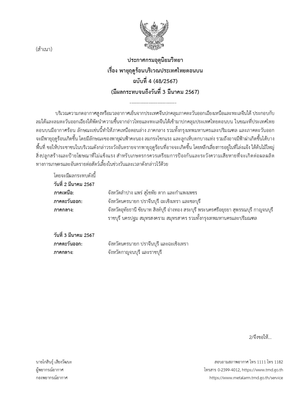 ประกาศกรมอุตุนิยมวิทยา เรื่อง พายุฤดูร้อนบริเวณประเทศไทยตอนบน ฉบับที่ 4 (48/2567) (มีผลกระทบจนถึงวันที่ 3 มีนาคม 2567)