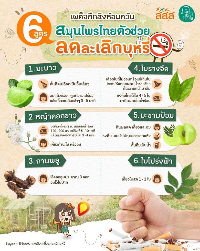 สำนักงานกองทุนสนับสนุนการสร้างเสริมสุขภาพ แนะนำ 6 สูตร สมุนไพรไทย ตัวช่วย ลด ละ เลิก บุหรี่ มะนาว หั่นติดเปลือกเป็นชิ้นเล็ก ๆ อมแล้วค่อย ๆ ดูดความเปรี้ยว เคี้ยวเปลือกช้า ๆ 3 – 5 นาที หญ้าดอกขาว ชงดื่มครั้งละ 2 ก. ผสมกับน้ำร้อน 120-200 มล. แช่ทิ้งไว้ 5 – 10 นาที ดื่มหลังอาหารวันละ 3-4 ครั้ง กานพลู ใช้ดอกตูมประมาณ 3 ดอก อมไว้ในปาก ใบรางจืด เลือกใบที่ไม่อ่อนหรือแก่เกินไป โขลกให้แหลกผสมน้ำซาวข้าว คั้นแต่น้ำมาดื่ม ใช้ใบ 4 – 5 ใบ มาฉีกผสมในน้ำร้อน มะขามป้อม กินผลสด เคี้ยวและอม ชงดื่ม โดยนำไปทุบและตากแห้ง คั้นดื่มเป็นน้ำ ใบโปร่งฟ้า เคี้ยวใบสด 1 – 2 ใบ